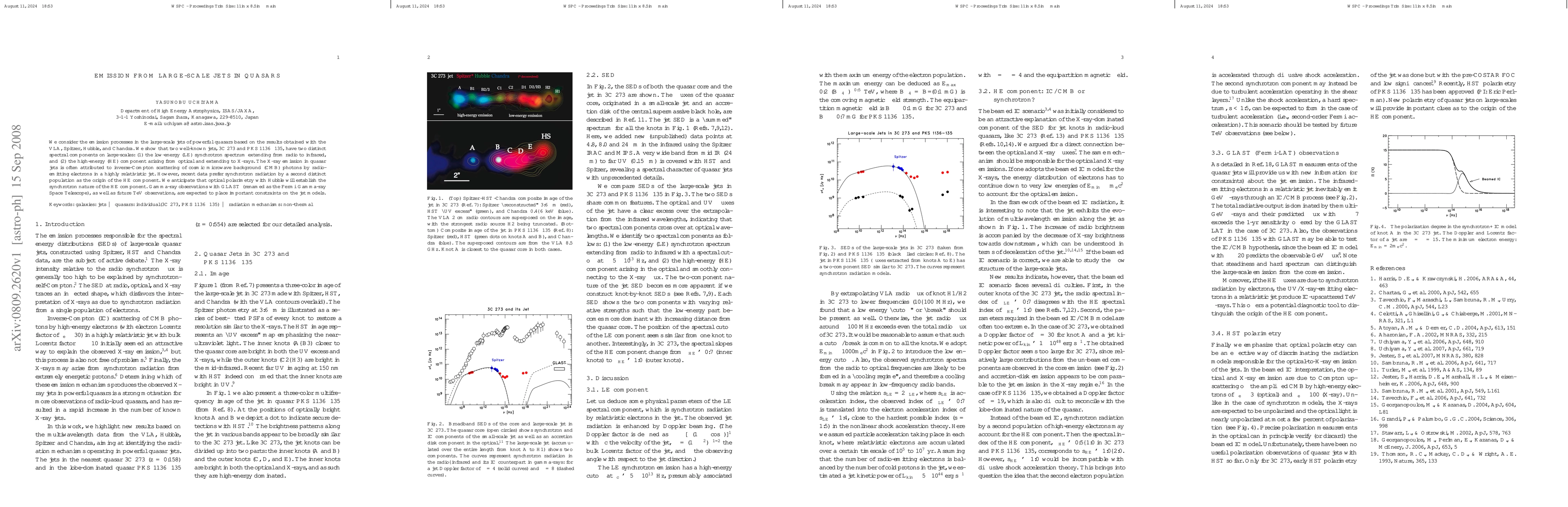 We consider the emission processes in the large-scale jets of powerful quasars based on the results obtained with the VLA, Spitzer, Hubble, and Chandra. We show that two well-known jets, 3C 273 and PKS 1136-135, have two distinct spectral components on large-scales: (1) the low-energy (LE) synchrotron spectrum extending from radio to infrared, and (2) the high-energy (HE) component arising from optical and extending to X-rays. The X-ray emission in quasar jets is often attributed to inverse-Compton scattering of cosmic microwave background (CMB) photons by radio-emitting electrons in a highly relativistic jet. However, recent data prefer synchrotron radiation by a second distinct population as the origin of the HE component. We anticipate that optical polarimetry with Hubble will establish the synchrotron nature of the HE component. Gamma-ray observations with GLAST (renamed as the Fermi Gamma-ray Space Telescope), as well as future TeV observations, are expected to place important constraints on the jet models.