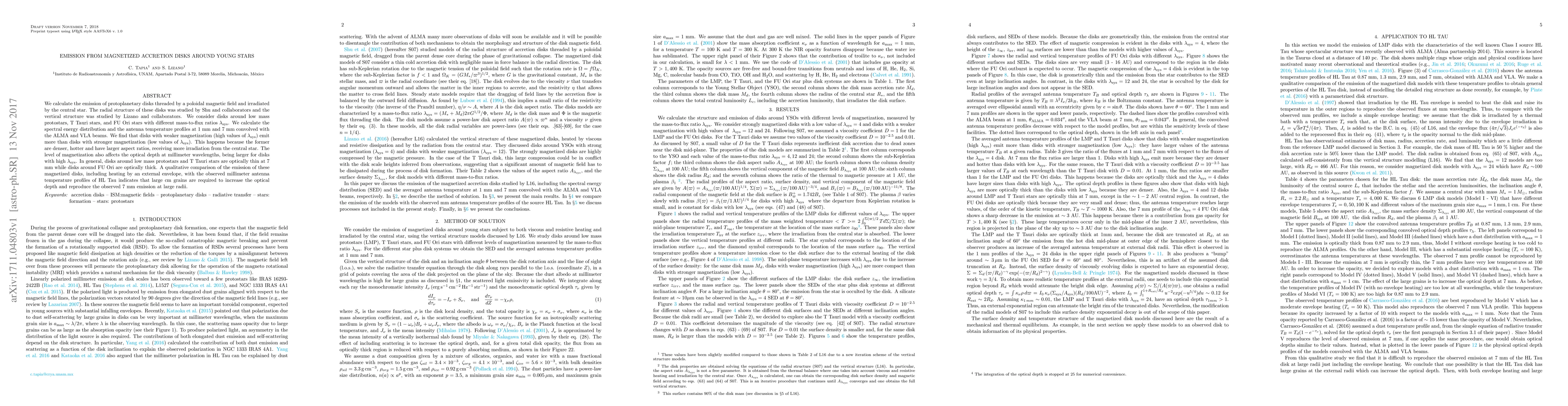 This paper investigates the emission from magnetized accretion disks around young stars, finding that less magnetized disks (higher mass-to-flux ratios) emit more due to their higher density, temperature, and aspect ratio, leading to greater central star irradiation. The study also reveals that disks around low mass protostars and T Tauri stars are optically thin at 7 mm, while FU Ori disks are optically thick, and large cm grains are needed to match observed millimeter emissions.