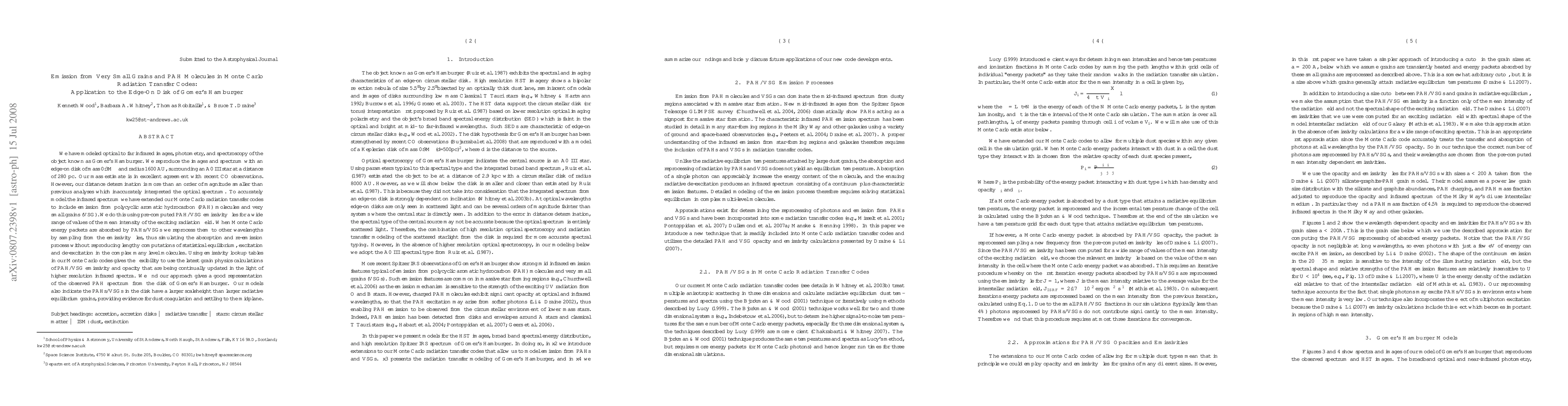 We have modeled optical to far infrared images, photometry, and spectroscopy of the object known as Gomez's Hamburger. We reproduce the images and spectrum with an edge-on disk of mass 0.3M_sun and radius 1600AU, surrounding an A0 III star at a distance of 280pc. Our mass estimate is in excellent agreement with recent CO observations. However, our distance determination is more than an order of magnitude smaller than previous analyses which inaccurately interpreted the optical spectrum. To accurately model the infrared spectrum we have extended our Monte Carlo radiation transfer codes to include emission from polycyclic aromatic hydrocarbon (PAH) molecules and very small grains (VSG). We do this using pre-computed PAH/VSG emissivity files for a wide range of values of the mean intensity of the exciting radiation field. When Monte Carlo energy packets are absorbed by PAHs/VSGs we reprocess them to other wavelengths by sampling from the emissivity files, thus simulating the absorption and re-emission process without reproducing lengthy computations of statistical equilibrium, excitation and de-excitation in the complex many level molecules. Using emissivity lookup tables in our Monte Carlo codes gives the flexibility to use the latest grain physics calculations of PAH/VSG emissivity and opacity that are being continually updated in the light of higher resolution infrared spectra. We find our approach gives a good representation of the observed PAH spectrum from the disk of Gomez's Hamburger. Our models also indicate the PAHs/VSGs in the disk have a larger scaleheight than larger radiative equilibrium grains, providing evidence for dust coagulation and settling to the midplane.