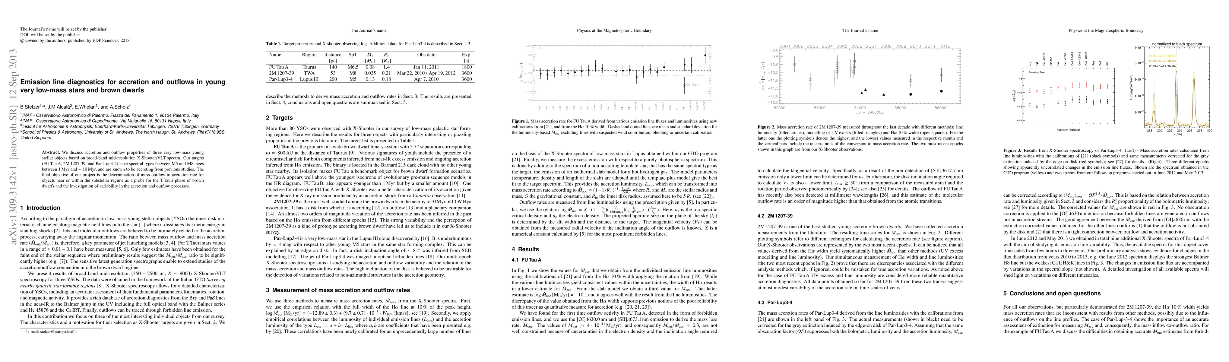 We discuss accretion and outflow properties of three very low-mass young stellar objects based on broad-band mid-resolution X-Shooter/VLT spectra. Our targets (FU TauA, 2M 1207-39, and Par-Lup3-4) have spectral types between M5 and M8, ages between 1 Myr and ~10 Myr, and are known to be accreting from previous studies. The final objective of our project is the determination of mass outflow to accretion rate for objects near or within the substellar regime as a probe for the T Tauri phase of brown dwarfs and the investigation of variability in the accretion and outflow processes.