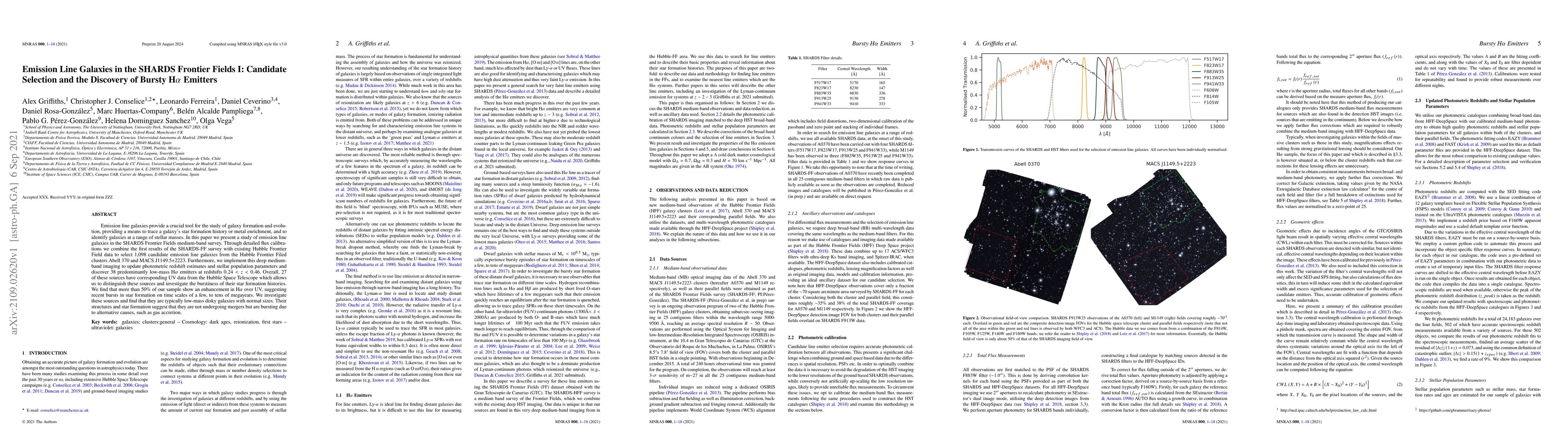 This paper identifies 1,098 candidate emission line galaxies from the SHARDS Frontier Fields survey, combining it with Hubble Frontier Field data. It discovers 38 low-mass Hα emitters showing recent star formation bursts, likely driven by gas accretion rather than mergers, based on UV data from the Hubble Space Telescope.