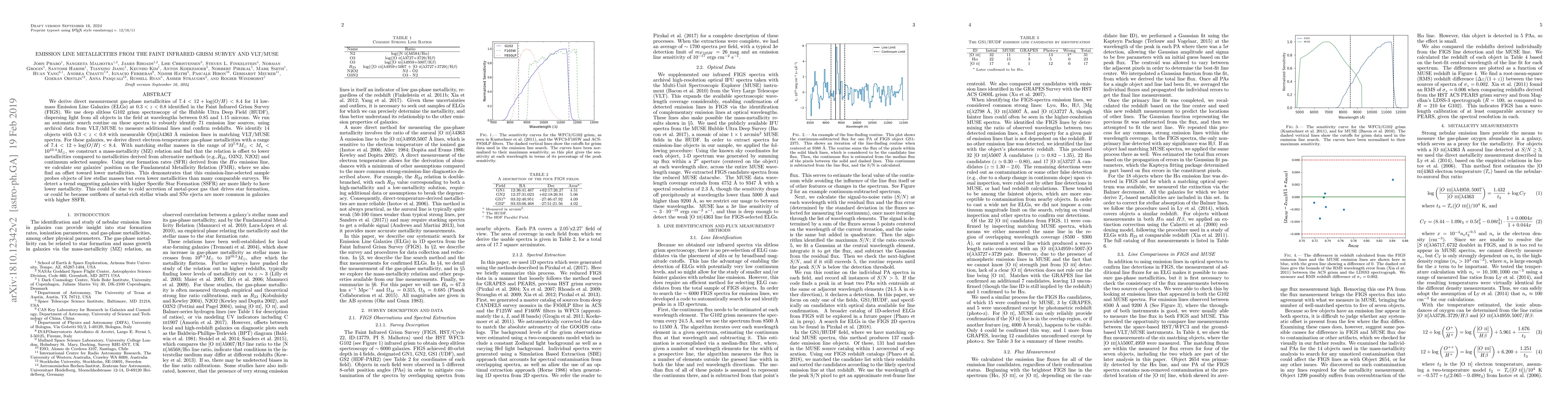 We derive direct measurement gas-phase metallicities of $7.4 < 12 + \log(O/H) < 8.4$ for 14 low-mass Emission Line Galaxies (ELGs) at $0.3 < z < 0.8$ identified in the Faint Infrared Grism Survey (FIGS). We use deep slitless G102 grism spectroscopy of the Hubble Ultra Deep Field (HUDF), dispersing light from all objects in the field at wavelengths between 0.85 and 1.15 microns. We run an automatic search routine on these spectra to robustly identify 71 emission line sources, using archival data from VLT/MUSE to measure additional lines and confirm redshifts. We identify 14 objects with $0.3 < z < 0.8$ with measurable O[III]$\lambda$4363 \AA\ emission lines in matching VLT/MUSE spectra. For these galaxies, we derive direct electron-temperature gas-phase metallicities with a range of $7.4 < 12 + \log(O/H) < 8.4$. With matching stellar masses in the range of $10^{7.9} M_{\odot} < M_{\star} < 10^{10.4} M_{\odot}$, we construct a mass-metallicity (MZ) relation and find that the relation is offset to lower metallicities compared to metallicities derived from alternative methods (e.g.,$R_{23}$, O3N2, N2O2) and continuum selected samples. Using star formation rates (SFR) derived from the $H\alpha$ emission line, we calculate our galaxies' position on the Fundamental Metallicity Relation (FMR), where we also find an offset toward lower metallicities. This demonstrates that this emission-line-selected sample probes objects of low stellar masses but even lower metallicities than many comparable surveys. We detect a trend suggesting galaxies with higher Specific Star Formation (SSFR) are more likely to have lower metallicity. This could be due to cold accretion of metal-poor gas that drives star formation, or could be because outflows of metal-rich stellar winds and SNe ejecta are more common in galaxies with higher SSFR.