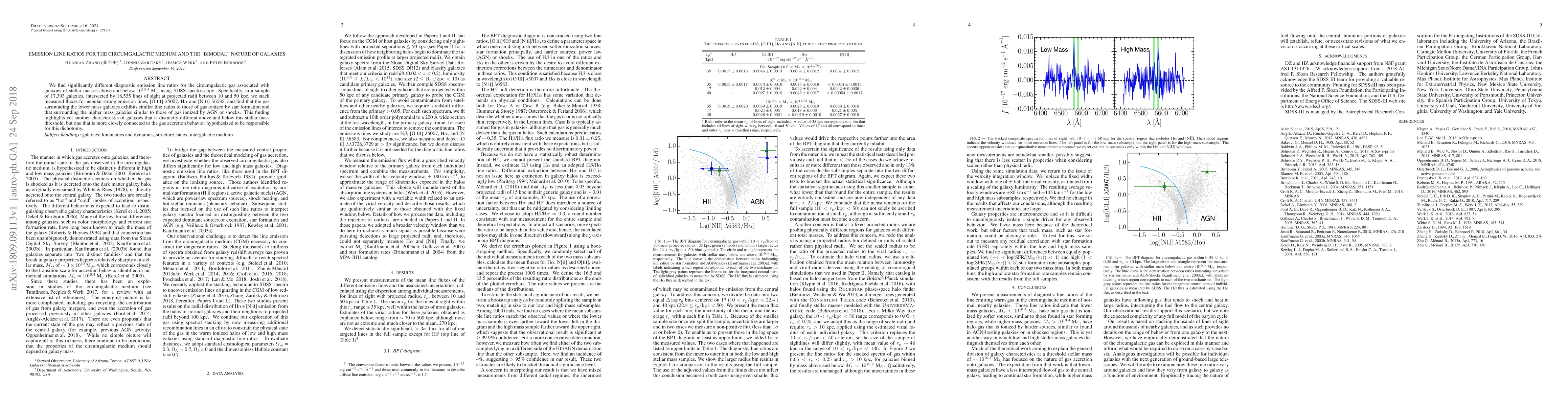 This paper reveals distinct emission line ratios in the circumgalactic medium of galaxies above and below $10^{10.4}$ M$_\odot$, suggesting star formation influences lower mass galaxies while AGN or shocks affect higher mass galaxies. This supports the "bimodal" nature of galaxies' gas accretion behavior.