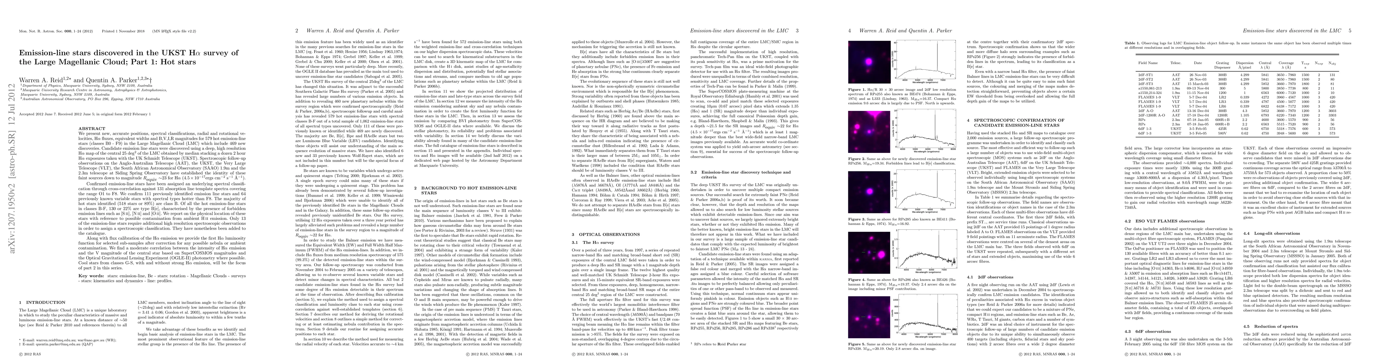 We present new, accurate positions, spectral classifications, radial and rotational velocities, H-alpha fluxes, equivalent widths and B,V,I,R magnitudes for 579 hot emission-line stars (classes B0 - F9) in the Large Magellanic Cloud which include 469 new discoveries. Candidate emission line stars were discovered using a deep, high resolution H-alpha map of the central 25 deg2 of the LMC obtained by median stacking a dozen 2 hour H-alpha exposures taken with the UK Schmidt Telescope. Spectroscopic follow-up observations on the AAT, UKST, VLT, the SAAO 1.9m and the MSSSO 2.3m telescope have established the identity of these faint sources down to magnitude R~23 for H-alpha (4.5 x 10^-17 ergs cm^2 s^-1 Ang). Confirmed emission-line stars have been assigned an underlying spectral classification through cross-correlation against 131 absorption line template spectra covering the range O1 to F8. We confirm 111 previously identified emission line stars and 64 previously known variable stars with spectral types hotter than F8. The majority of hot stars identified (518 stars or 89%) are class B. Of all the hot emission-line stars in classes B-F, 130 or 22% are type B[e], characterised by the presence of forbidden emission lines such as [SII], [NII] and [OII]. We report on the physical location of these stars with reference to possible contamination from ambient HII emission. Along with flux calibration of the H-alpha emission we provide the first H-alpha luminosity function for selected sub-samples after correction for any possible nebula or ambient contamination. We find a moderate correlation between the intensity of H-alpha emission and the V magnitude of the central star based on SuperCOSMOS magnitudes and OGLE-II photometry where possible. Cool stars from classes G-S, with and without strong H-alpha emission, will be the focus of part 2 in this series.