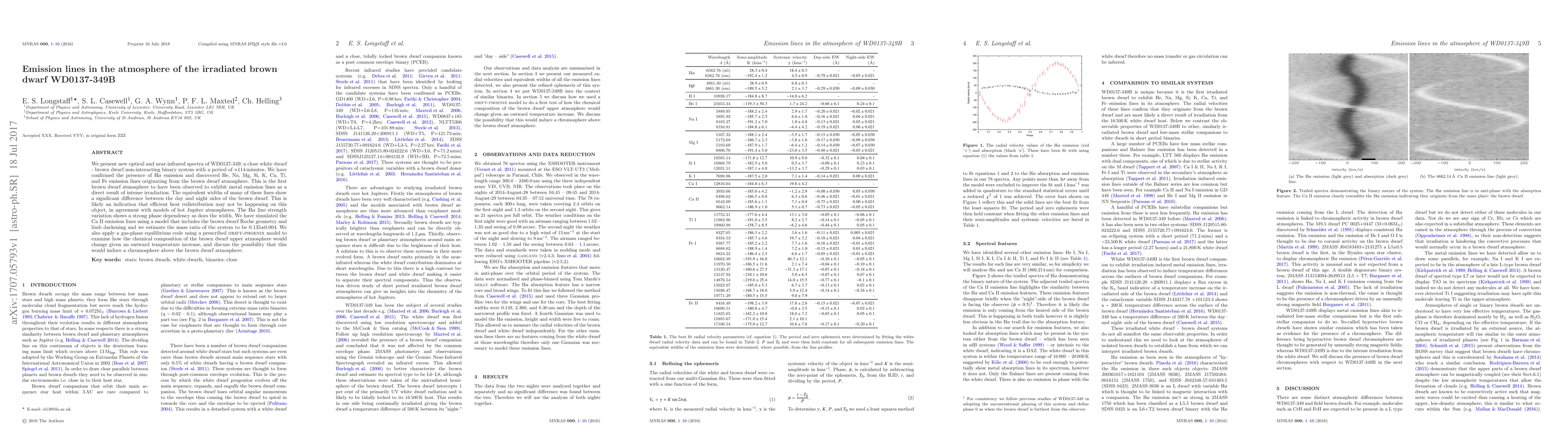 We present new optical and near-infrared spectra of WD0137-349; a close white dwarf - brown dwarf non-interacting binary system with a period of $\approx$114 minutes. We have confirmed the presence of H$\alpha$ emission and discovered He, Na, Mg, Si, K, Ca, Ti, and Fe emission lines originating from the brown dwarf atmosphere. This is the first brown dwarf atmosphere to have been observed to exhibit metal emission lines as a direct result of intense irradiation. The equivalent widths of many of these lines show a significant difference between the day and night sides of the brown dwarf. This is likely an indication that efficient heat redistribution may not be happening on this object, in agreement with models of hot Jupiter atmospheres. The H$\alpha$ line strength variation shows a strong phase dependency as does the width. We have simulated the Ca II emission lines using a model that includes the brown dwarf Roche geometry and limb darkening and we estimate the mass ratio of the system to be 0.135$\pm$0.004. We also apply a gas-phase equilibrium code using a prescribed drift-phoenix model to examine how the chemical composition of the brown dwarf upper atmosphere would change given an outward temperature increase, and discuss the possibility that this would induce a chromosphere above the brown dwarf atmosphere.