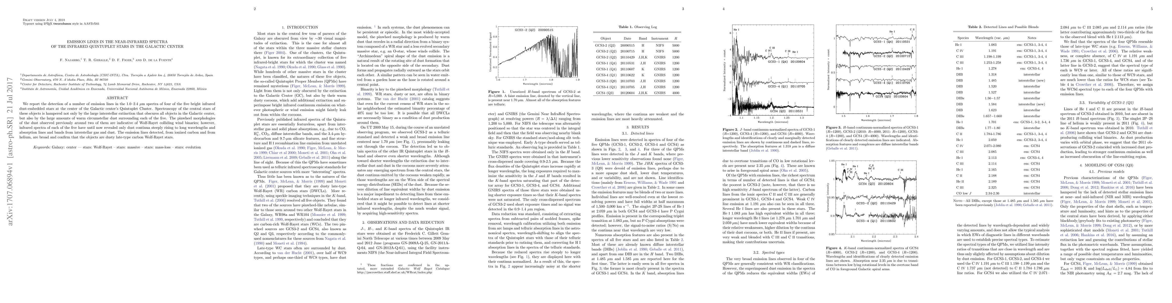This paper reports the detection of broad emission lines from ionized carbon and helium in the near-infrared spectra of four out of five infrared stars in the Galactic Center's Quintuplet Cluster, confirming they are dusty late-type carbon Wolf-Rayet stars. The detections help overcome the challenges posed by interstellar extinction and warm circumstellar dust.