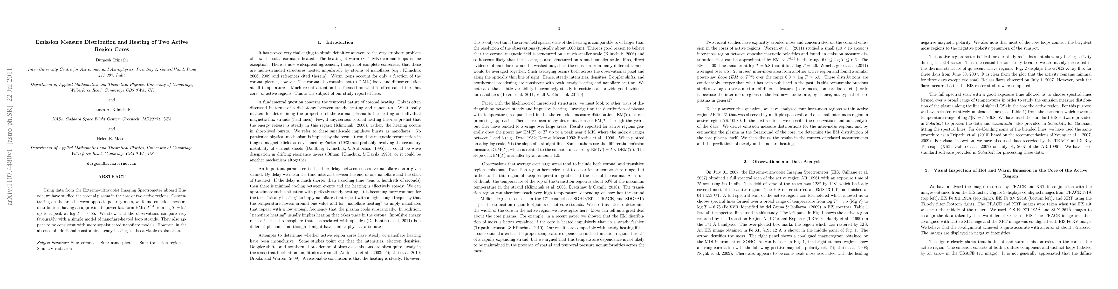 Using data from the Extreme-ultraviolet Imaging Spectrometer aboard Hinode, we have studied the coronal plasma in the core of two active regions. Concentrating on the area between opposite polarity moss, we found emission measure distributions having an approximate power-law form EM$\propto T^{2.4}$ from $\log\,T = 5.5$ up to a peak at $\log\,T = 6.55$. We show that the observations compare very favorably with a simple model of nanoflare-heated loop strands. They also appear to be consistent with more sophisticated nanoflare models. However, in the absence of additional constraints, steady heating is also a viable explanation.