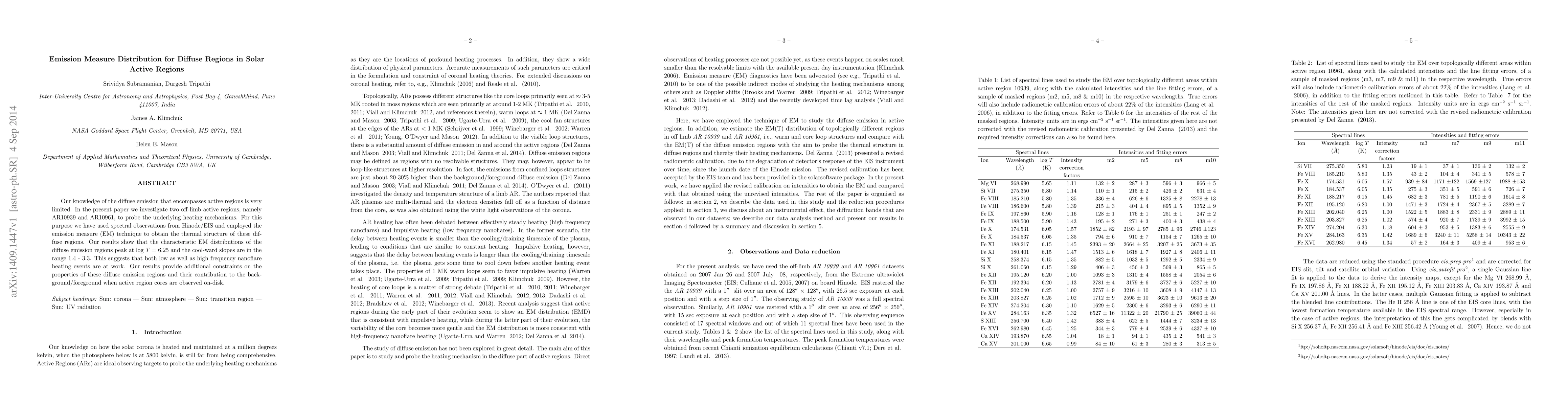 Our knowledge of the diffuse emission that encompasses active regions is very limited. In the present paper we investigate two off-limb active regions, namely AR10939 and AR10961, to probe the underlying heating mechanisms. For this purpose we have used spectral observations from Hinode/EIS and employed the emission measure (EM) technique to obtain the thermal structure of these diffuse regions. Our results show that the characteristic EM distributions of the diffuse emission regions peak at log T = 6.25 and the cool-ward slopes are in the range 1.4 - 3.3. This suggests that both low as well as high frequency nanoflare heating events are at work. Our results provide additional constraints on the properties of these diffuse emission regions and their contribution to the background/foreground when active region cores are observed on-disk.