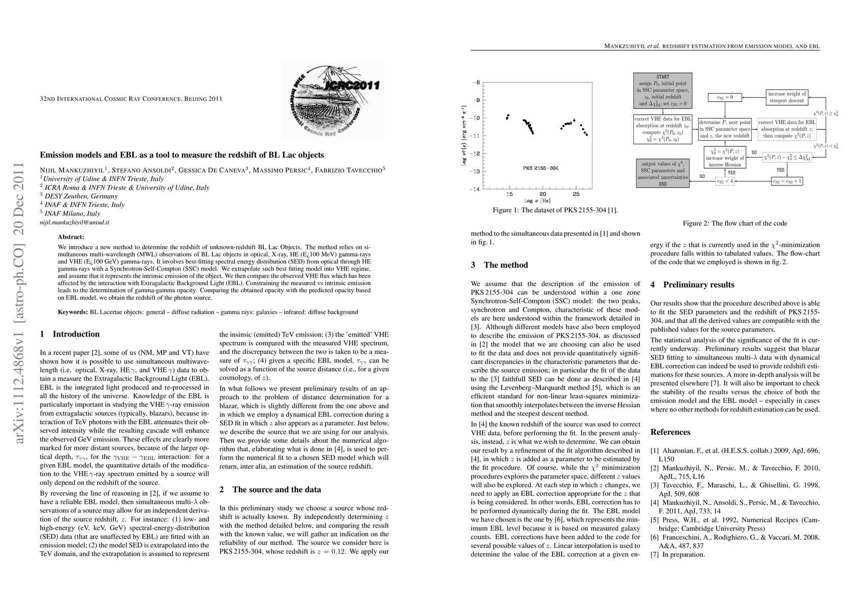 We introduce a new method to determine the redshift of unknown-redshift BL Lac Objects. The method relies on simultaneous multi-wavelength (MWL) observations of BL Lac objects in optical, X-ray, HE (E>100 MeV) gamma-rays and VHE (E>100 GeV)gamma-rays. It involves best-fitting spectral energy distribution (SED) from optical through HE gamma-rays with a Synchrotron-Self-Compton (SSC) model. We extrapolate such best fitting model into VHE regime, and assume that it represents the intrinsic emission of the object. We then compare the observed VHE flux which has been affected by the interaction with Extragalactic Background Light (EBL). Constraining the measured vs intrinsic emission leads to the determination of gamma-gamma opacity. Comparing the obtained opacity with the predicted opacity based on EBL model, we obtain the redshift of the photon source.