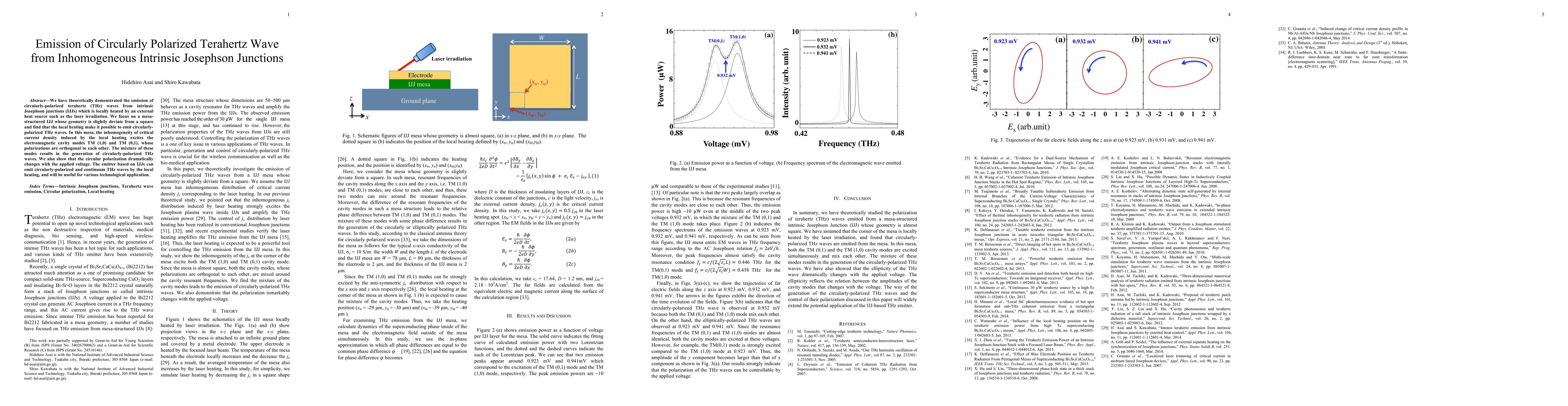 We have theoretically demonstrated the emission of circularly-polarized terahertz (THz) waves from intrinsic Josephson junctions (IJJs) which is locally heated by an external heat source such as the laser irradiation. We focus on a mesa-structured IJJ whose geometry is slightly deviate from a square and find that the local heating make it possible to emit circularly-polarized THz waves. In this mesa, the inhomogeneity of critical current density induced by the local heating excites the electromagnetic cavity modes TM (1,0) and TM (0,1), whose polarizations are orthogonal to each other. The mixture of these modes results in the generation of circularly-polarized THz waves. We also show that the circular polarization dramatically changes with the applied voltage. The emitter based on IJJs can emit circularly-polarized and continuum THz waves by the local heating, and will be useful for various technological application.