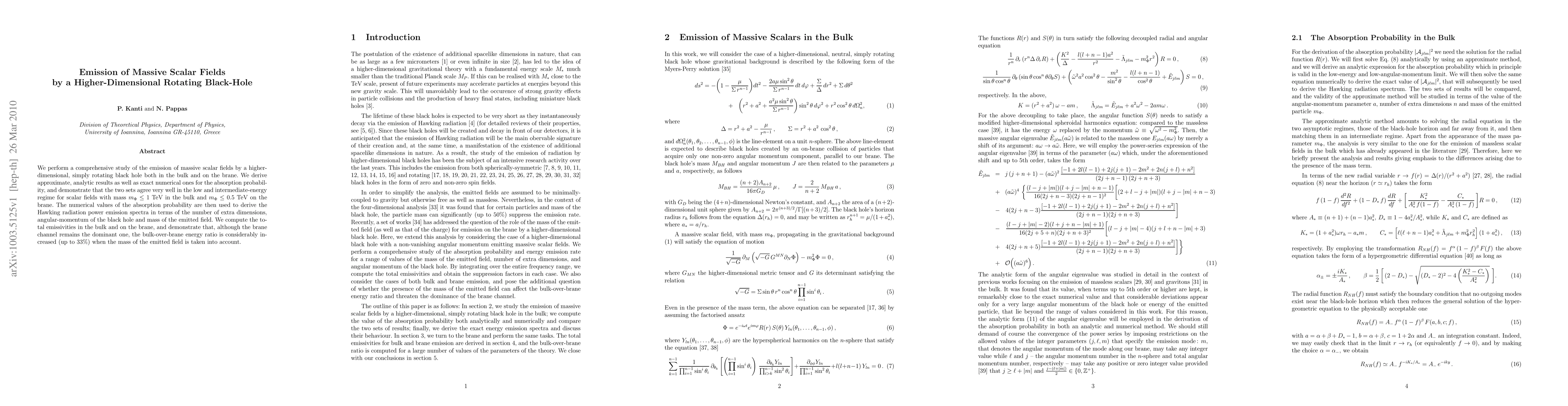 This study investigates the emission of massive scalar fields from a higher-dimensional rotating black hole, deriving both analytic and numerical absorption probabilities that agree well for low-energy regimes. The research computes Hawking radiation spectra, showing that while the brane channel is dominant, the bulk emission becomes significantly more efficient (up to 33%) when considering the mass of emitted fields.