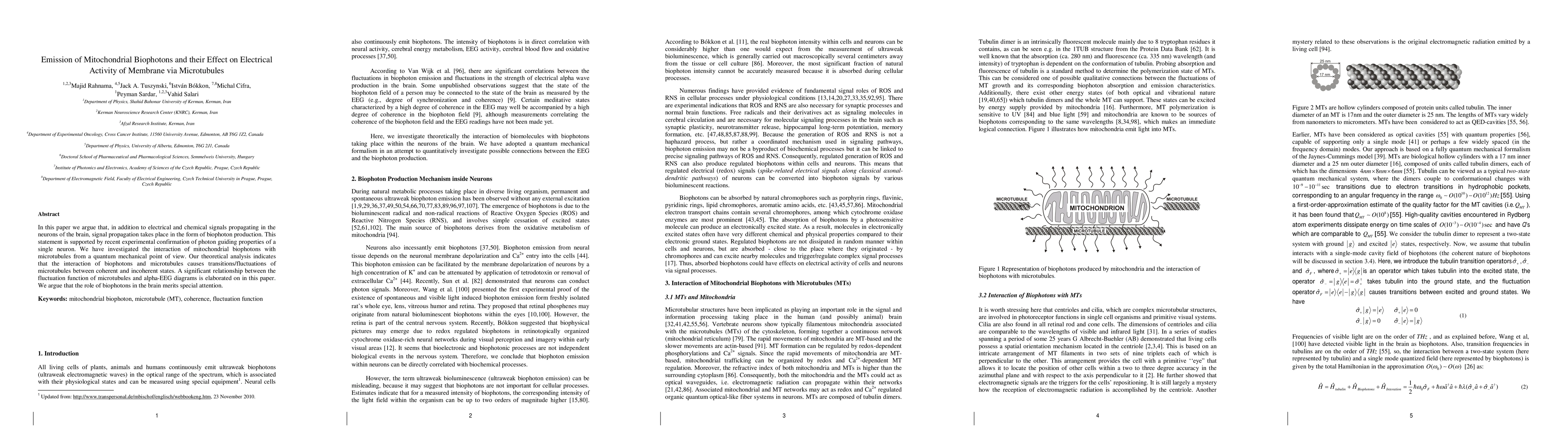 This paper proposes that biophotons emitted by mitochondria interact with microtubules, causing transitions between coherent and incoherent states, which correlate with alpha-EEG activity. The study suggests biophotons play a significant role in neuronal signal propagation beyond conventional electrical and chemical signals.
