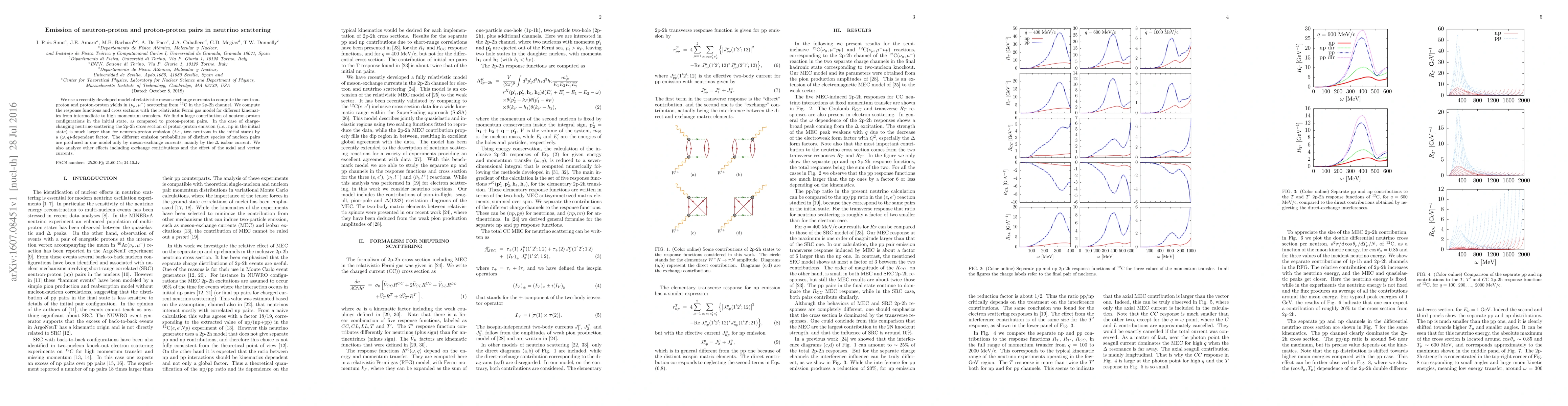 This paper investigates neutron-proton and proton-proton pair emissions in neutrino scattering from $^{12}$C using a relativistic meson-exchange current model. The study finds that neutron-proton pairs dominate in the initial state, with proton-proton pair emissions significantly larger due to meson-exchange currents, particularly the $\Delta$ isobar current.