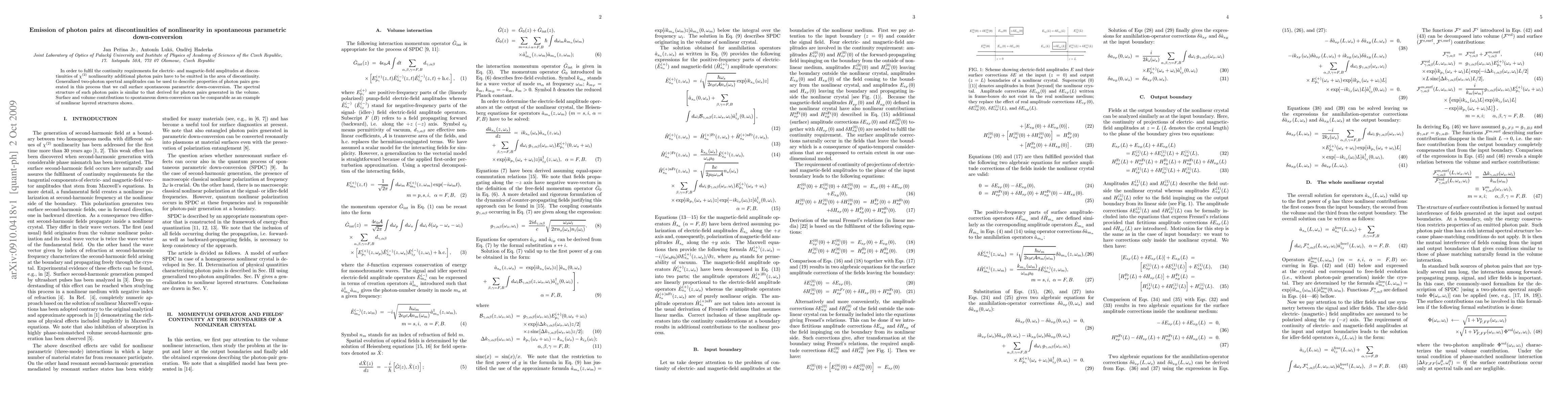 This paper explores the emission of photon pairs at discontinuities of χ2 nonlinearity in spontaneous parametric down-conversion, demonstrating that additional photon pairs are necessary to fulfill continuity requirements for electric and magnetic fields. The study introduces the concept of surface spontaneous parametric down-conversion and finds that its spectral structure parallels that of volume-generated photon pairs, with comparable contributions from both sources in nonlinear layered structures.