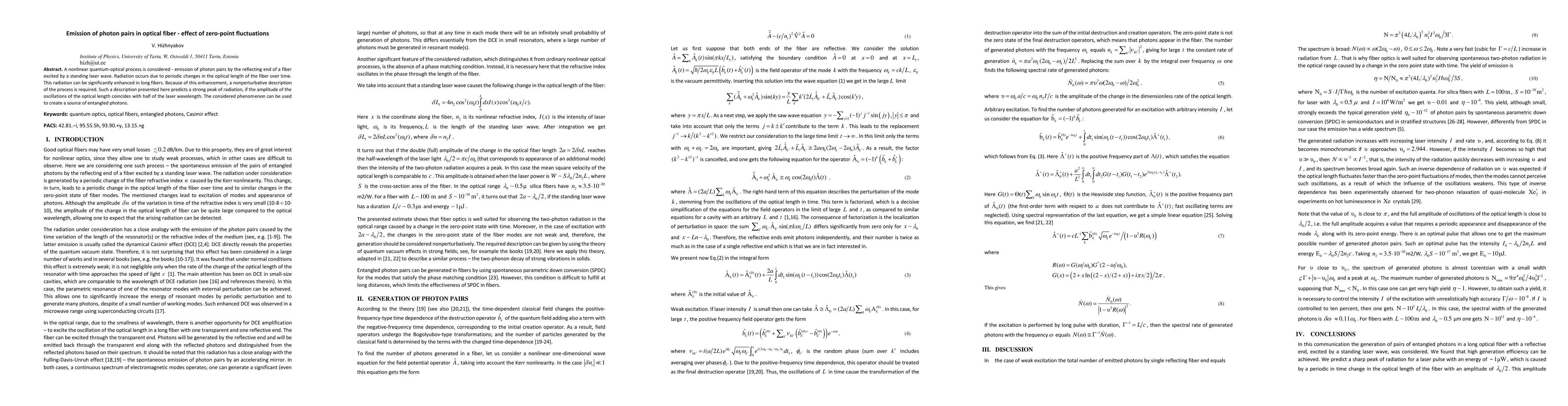 This paper investigates the nonlinear quantum-optical process of photon pair emission in optical fibers, driven by standing laser waves and enhanced by zero-point fluctuations. A nonperturbative model predicts a strong peak in radiation when the optical length oscillations match half the laser wavelength, potentially enabling the creation of entangled photon sources.