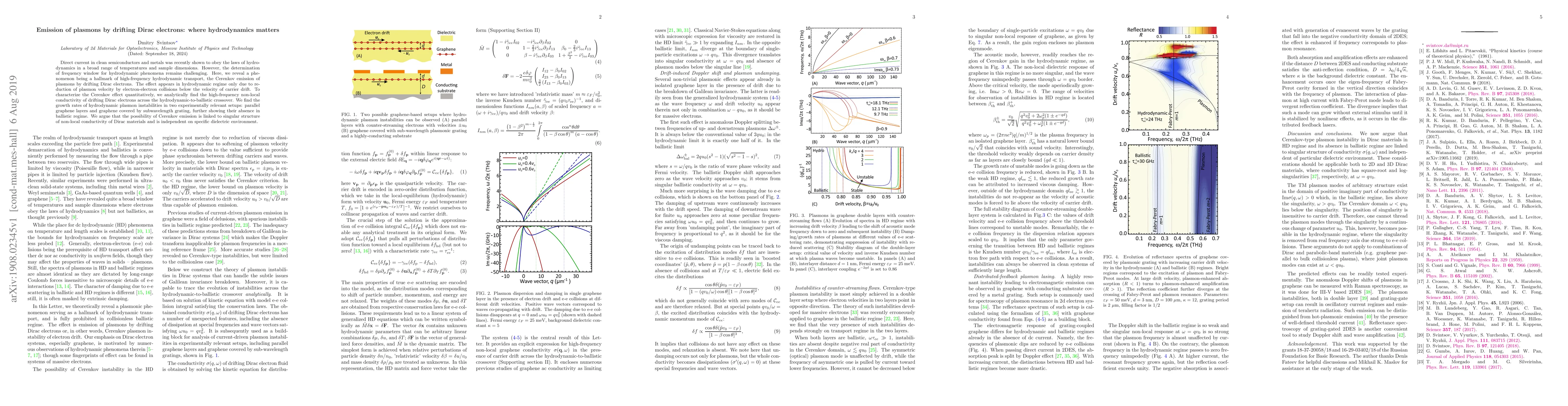 This paper explores the hydrodynamic behavior of drifting Dirac electrons in semiconductors and metals, highlighting the Cerenkov emission of plasmons due to reduced plasmon velocity by electron-electron collisions. The authors analytically determine the high-frequency non-local conductivity and find that this phenomenon occurs only in the hydrodynamic regime, with implications for graphene setups.