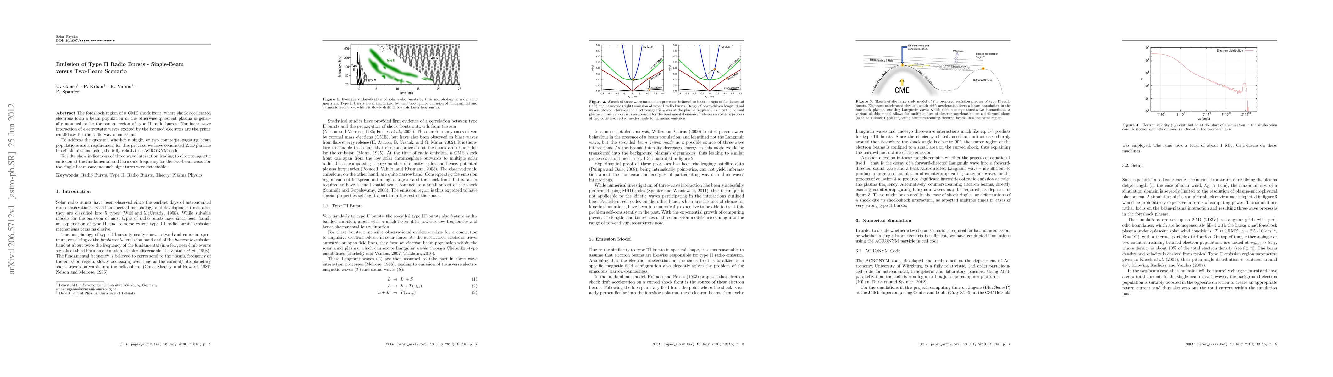 The foreshock region of a CME shock front, where shock accelerated electrons form a beam population in the otherwise quiescent plasma is generally assumed to be the source region of type II radio bursts. Nonlinear wave interaction of electrostatic waves excited by the beamed electrons are the prime candidates for the radio waves' emission. To address the question whether a single, or two counterpropagating beam populations are a requirement for this process, we have conducted 2.5D particle in cell simulations using the fully relativistic ACRONYM code. Results show indications of three wave interaction leading to electromagnetic emission at the fundamental and harmonic frequency for the two-beam case. For the single-beam case, no such signatures were detectable.