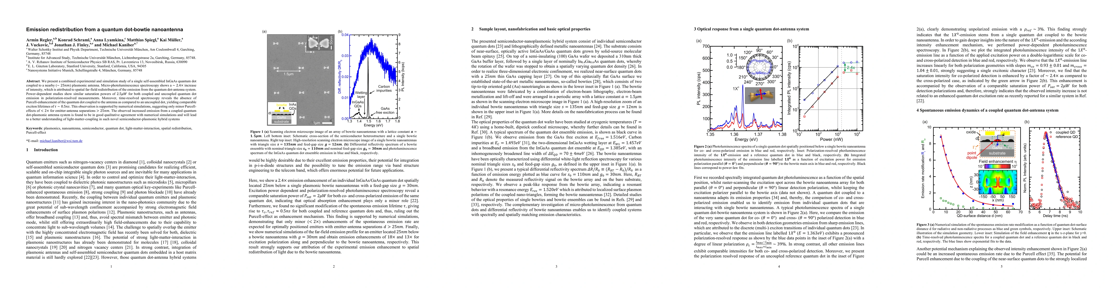 This study investigates the emission characteristics of a self-assembled InGaAs quantum dot coupled to a plasmonic bowtie antenna, revealing a significant increase in emission intensity due to spatial redistribution, without notable Purcell enhancement, as confirmed by both experimental and simulation results.
