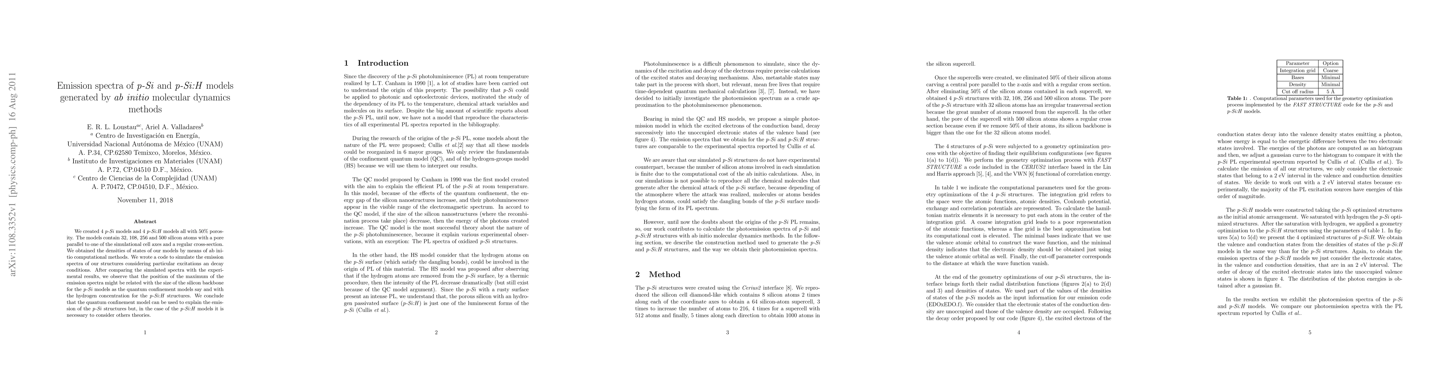We created 4 p-Si models and 4 p-Si:H models all with 50% porosity. The models contain 32, 108, 256 and 500 silicon atoms with a pore parallel to one of the simulational cell axes and a regular cross-section. We obtained the densities of states of our models by means of ab initio computational methods. We wrote a code to simulate the emission spectra of our structures considering particular excitations an decay conditions. After comparing the simulated spectra with the experimental results, we observe that the position of the maximum of the emission spectra might be related with the size of the silicon backbone for the p-Si models as the quantum confinement models say and with the hydrogen concentration for the p-Si:H structures. We conclude that the quantum confinement model can be used to explain the emission of the p-Si structures but, in the case of the p-Si:H models it is necessary to consider others theories.