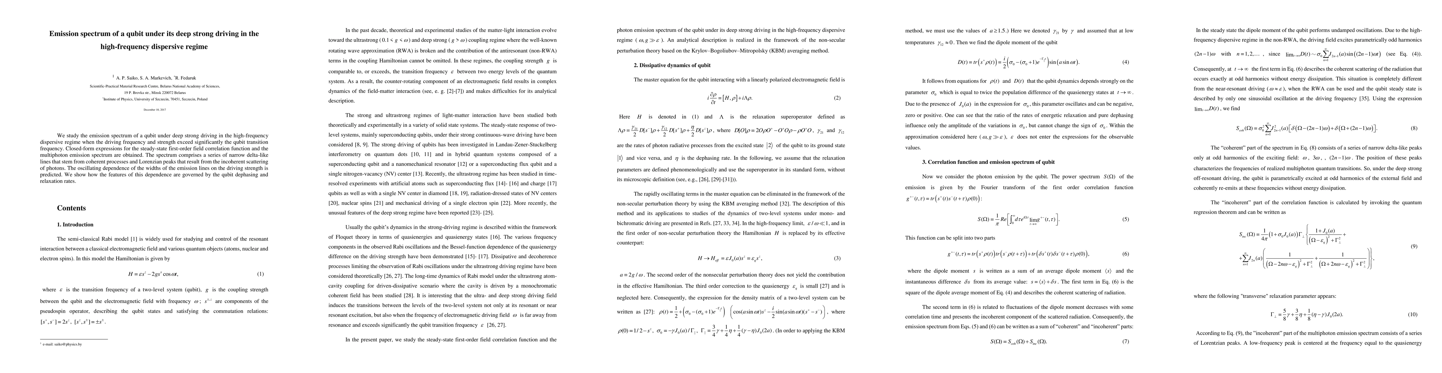 We study the emission spectrum of a qubit under deep strong driving in the high-frequency dispersive regime when the driving frequency and strength exceed significantly the qubit transition frequency. Closed-form expressions for the steady-state first-order field correlation function and the multiphoton emission spectrum are obtained. The spectrum comprises a series of narrow delta-like lines that stem from coherent processes and Lorenzian peaks that result from the incoherent scattering of photons. The oscillating dependence of the widths of the emission lines on the driving strength is predicted. We show how the features of this dependence are governed by the qubit dephasing and relaxation rates.