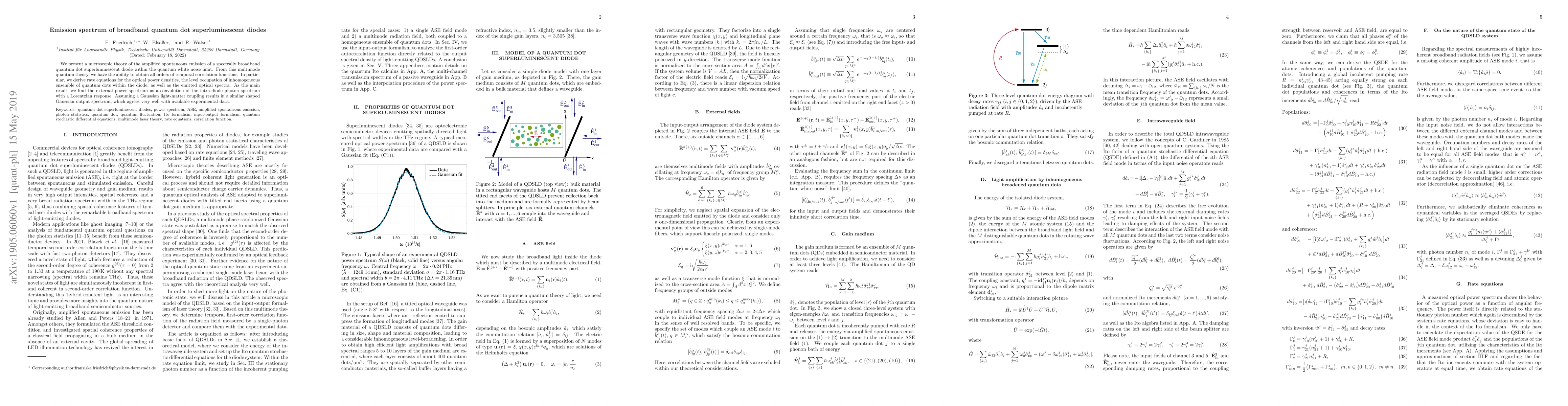 We present a microscopic theory of the amplified spontaneous emission of a spectrally broadband quantum dot superluminescent diode within the quantum white noise limit. From this multimode quantum theory, we have the ability to obtain all orders of temporal correlation functions. In particular, we derive rate equations for the optical power densities, the level occupation of inhomogeneous ensemble of quantum dots within the diode, as well as the emitted optical spectra. As the main result, we find the external power spectrum as a convolution of the intra-diode photon spectrum with a Lorentzian response. Assuming a Gaussian light-matter coupling results in a similar shaped Gaussian output spectrum, which agrees very well with available experimental data.