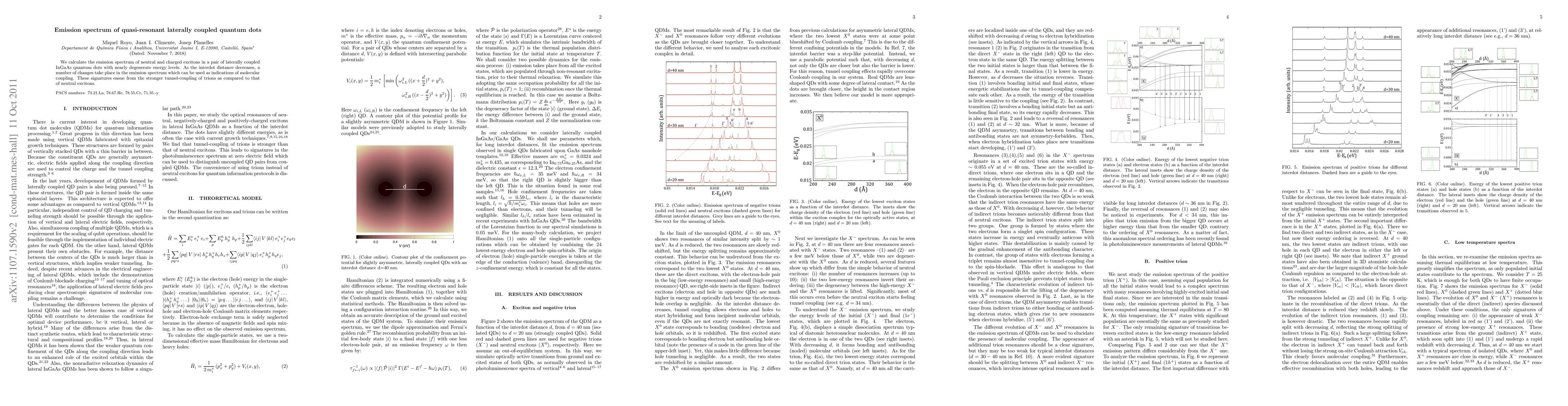 We calculate the emission spectrum of neutral and charged excitons in a pair of laterally coupled InGaAs quantum dots with nearly degenerate energy levels. As the interdot distance decreases, a number of changes take place in the emission spectrum which can be used as indications of molecular coupling. These signatures ensue from the stronger tunnel-coupling of trions as compared to that of neutral excitons.