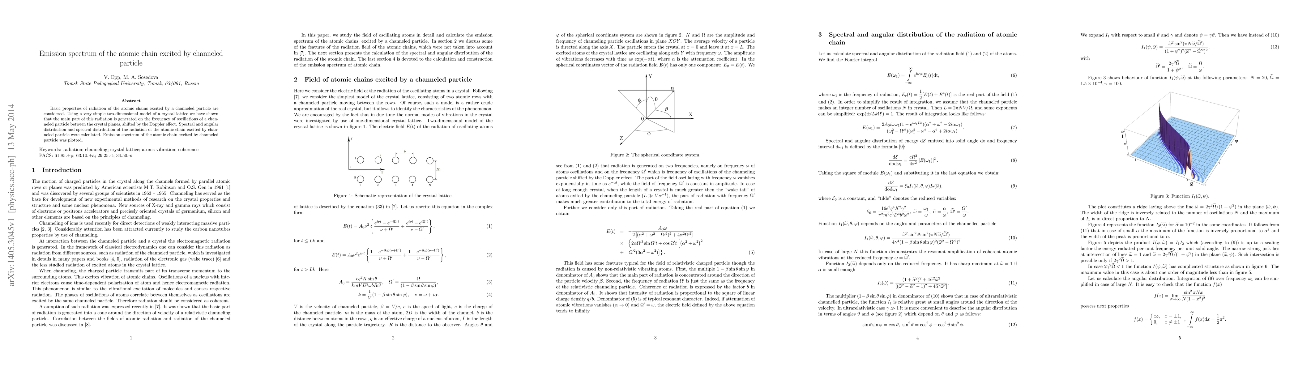 This paper investigates the emission spectrum of atomic chains excited by channeled particles, demonstrating that the primary radiation frequency is influenced by the Doppler effect due to oscillations between crystal planes. The study provides calculations for spectral and angular distributions, and plots the emission spectrum.