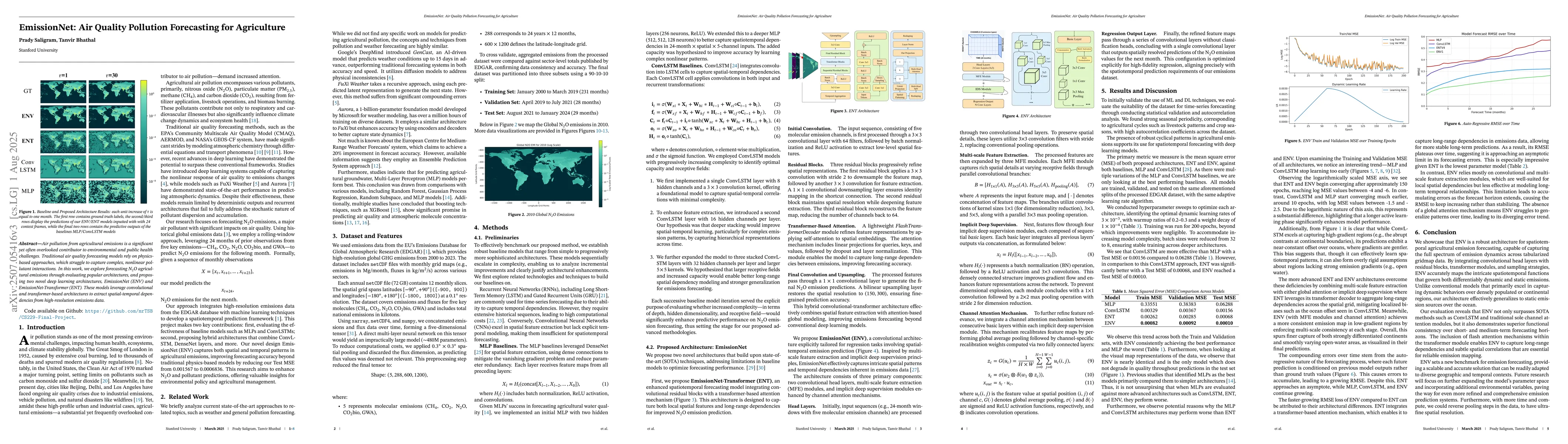 Air pollution from agricultural emissions is a significant yet often overlooked contributor to environmental and public health challenges. Traditional air quality forecasting models rely on physics-based approaches, which struggle to capture complex, nonlinear pollutant interactions. In this work, we explore forecasting N$_2$O agricultural emissions through evaluating popular architectures, and proposing two novel deep learning architectures, EmissionNet (ENV) and EmissionNet-Transformer (ENT). These models leverage convolutional and transformer-based architectures to extract spatial-temporal dependencies from high-resolution emissions data