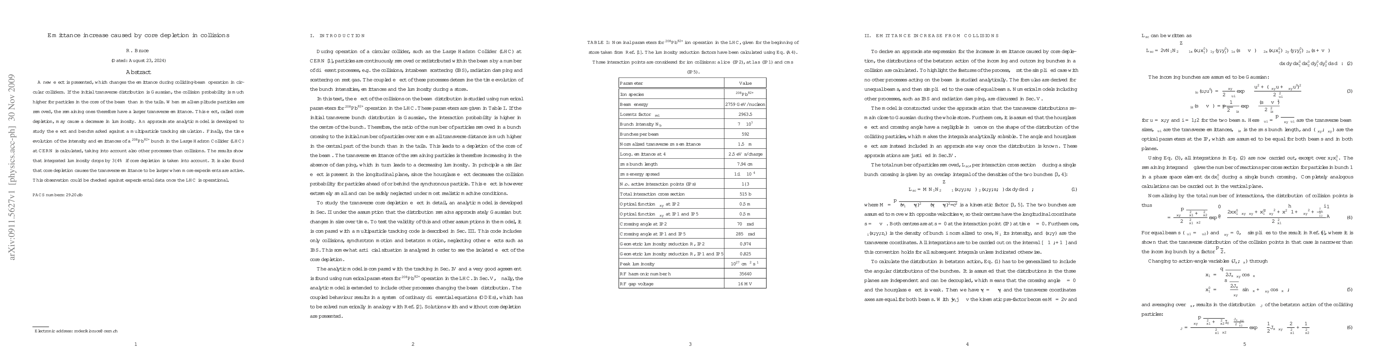 A new effect is presented, which changes the emittance during colliding-beam operation in circular colliders. If the initial transverse distribution is Gaussian, the collision probability is much higher for particles in the core of the beam than in the tails. When small-amplitude particles are removed, the remaining ones therefore have a larger transverse emittance. This effect, called core depletion, may cause a decrease in luminosity. An approximate analytic model is developed to study the effect and benchmarked against a multiparticle tracking simulation. Finally, the time evolution of the intensity and emittances of a Pb bunch in the Large Hadron Collider (LHC) at CERN is calculated, taking into account also other processes than collisions. The results show that integrated luminosity drops by 3--4% if core depletion is taken into account. It is also found that core depletion causes the transverse emittance to be larger when more experiments are active. This observation could be checked against experimental data once the LHC is operational.