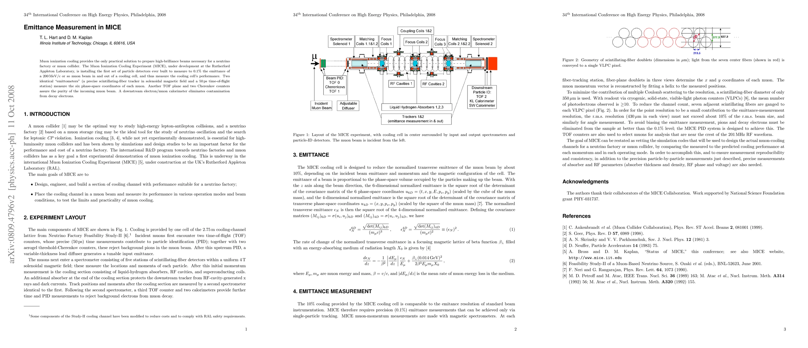 Muon ionization cooling provides the only practical solution to prepare high-brilliance beams necessary for a neutrino factory or muon collider. The Muon Ionization Cooling Experiment (MICE), under development at the Rutherford Appleton Laboratory, is installing the first set of particle detectors ever built to measure to 0.1% the emittance of a 200 MeV/c or so muon beam in and out of a cooling cell, and thus measure the cooling cell's performance. Two identical "emittometers" (a precise scintillating-fiber tracker in solenoidal magnetic field and a 50 ps time-of-flight station) measure the six phase-space coordinates of each muon. Another TOF plane and two Cherenkov counters assure the purity of the incoming muon beam. A downstream electron/muon calorimeter eliminates contamination from decay electrons.