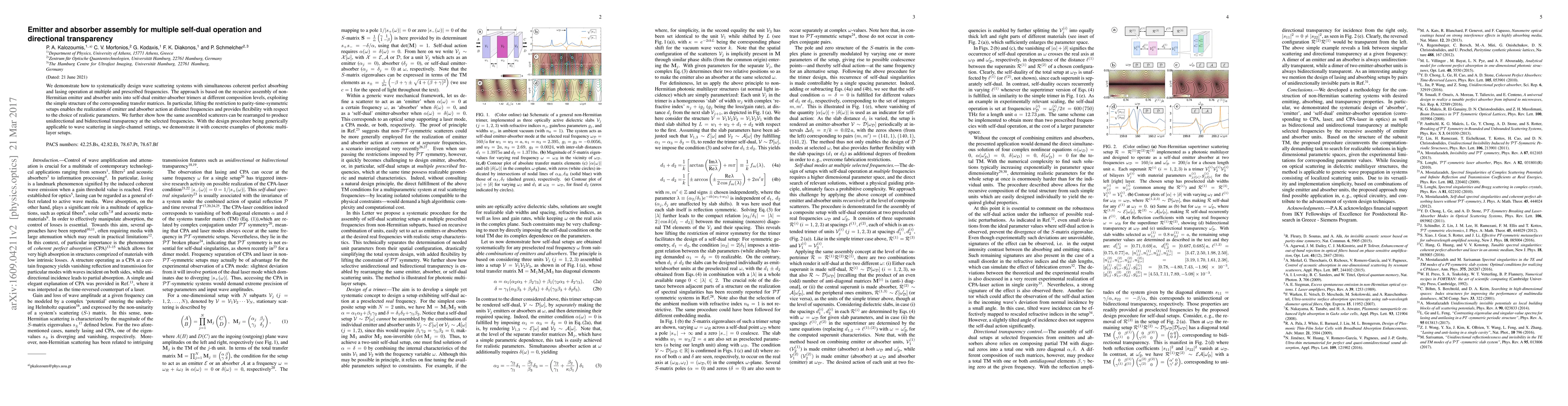 This paper proposes a recursive design method for scatterers that function both as emitters and absorbers at multiple frequencies, using self-dual emitter-absorber trimers. The approach allows for directional transparency and flexibility in parameter selection, applicable to photonic multilayer setups.