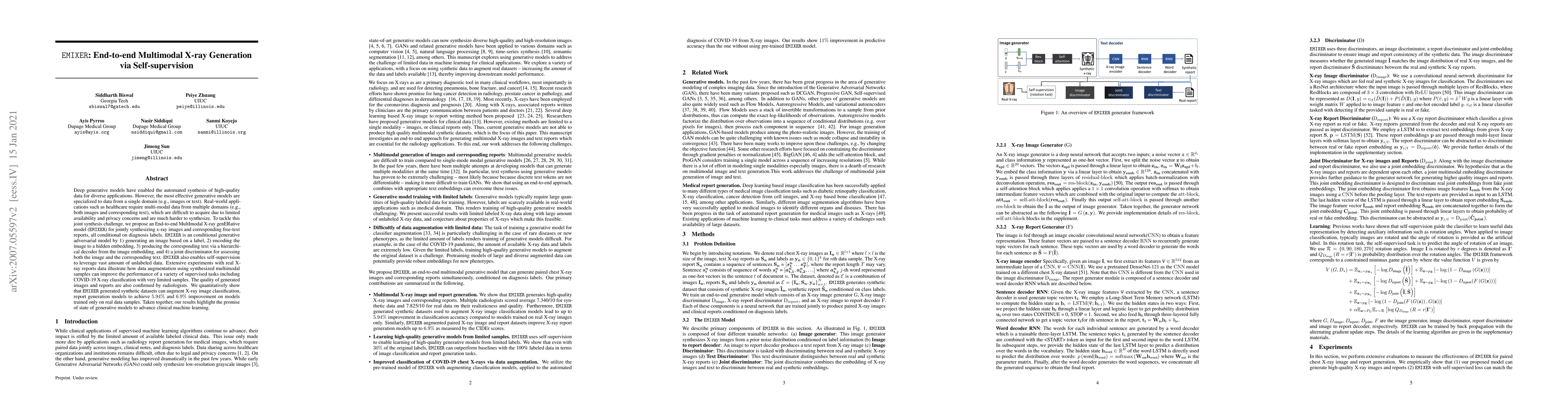 EMIXER is a conditional generative adversarial model designed to jointly synthesize x-ray images and corresponding free-text reports using diagnosis labels. It leverages self-supervision to utilize large amounts of unlabeled data, showing significant improvements in clinical machine learning tasks when augmenting real datasets.