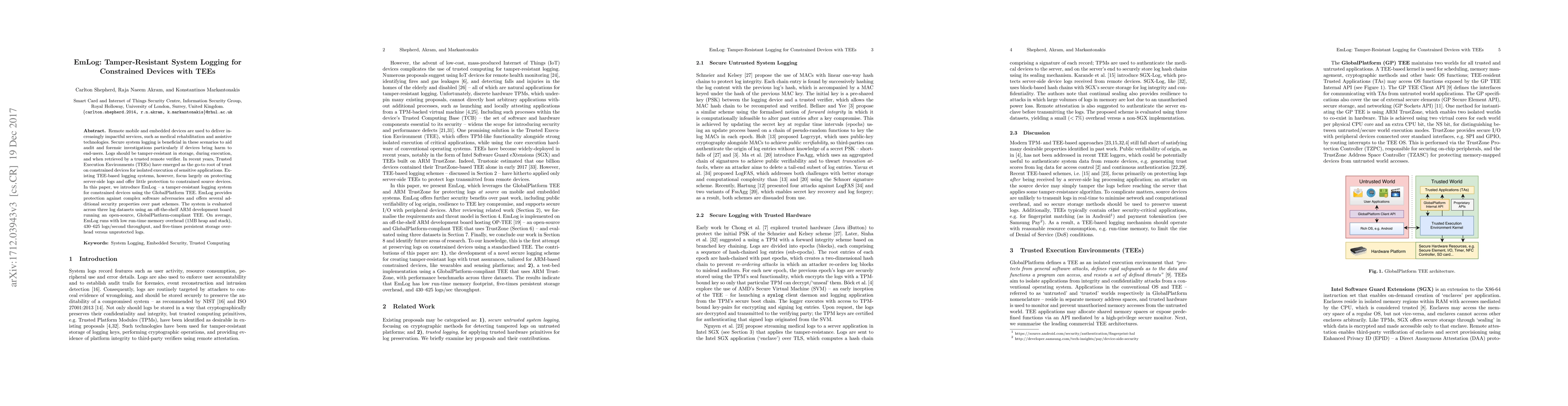 EmLog is a tamper-resistant logging system for constrained devices using Trusted Execution Environments (TEEs) to protect logs from adversaries. It offers enhanced security properties and low memory overhead, achieving 430-625 logs/second throughput.