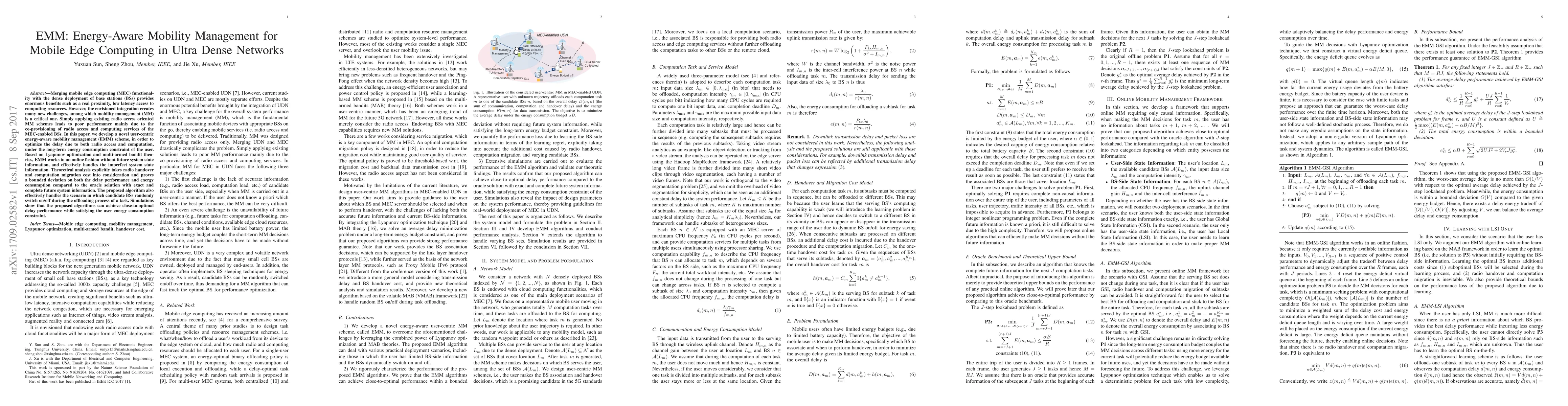 This paper proposes an energy-aware mobility management (EMM) scheme for mobile edge computing in ultra-dense networks, optimizing both radio access and computation delay while managing long-term energy consumption. The EMM scheme leverages Lyapunov optimization and multi-armed bandit theories to handle imperfect system state information and dynamic base station availability.