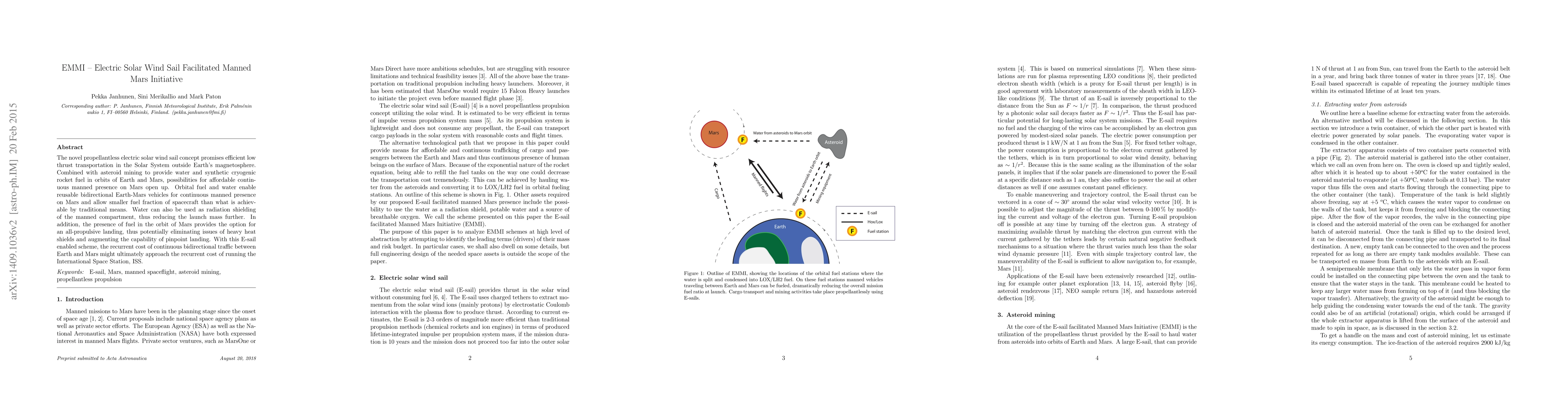 The EMMI initiative proposes a solar wind sail for efficient, low-thrust interplanetary transport, enabling continuous manned presence on Mars through asteroid mining for water and fuel. This reduces launch mass and operational costs, potentially rivaling the ISS's recurrent expenses.
