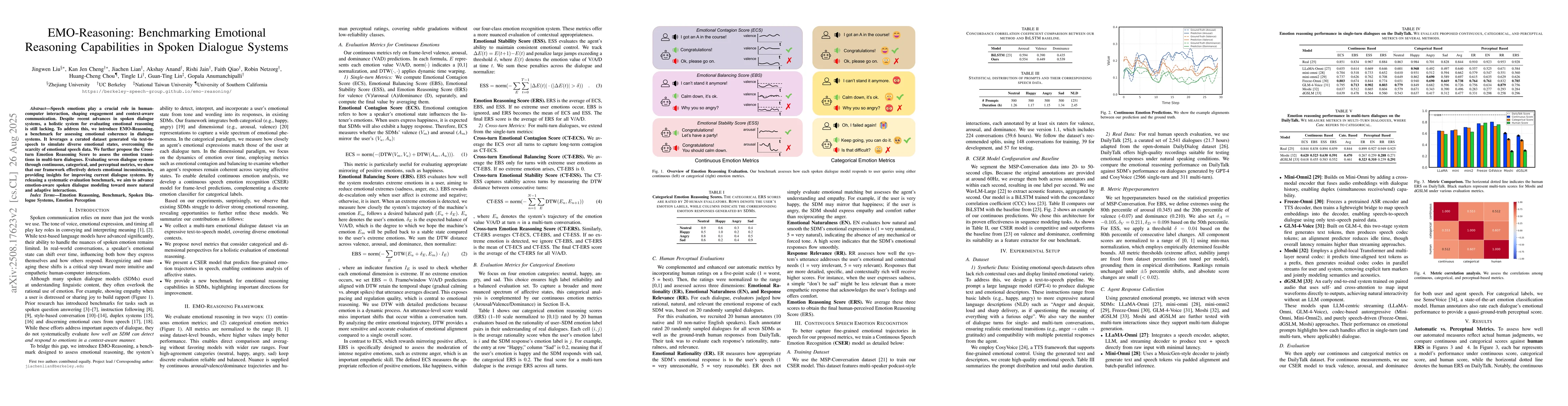 Speech emotions play a crucial role in human-computer interaction, shaping engagement and context-aware communication. Despite recent advances in spoken dialogue systems, a holistic system for evaluating emotional reasoning is still lacking. To address this, we introduce EMO-Reasoning, a benchmark for assessing emotional coherence in dialogue systems. It leverages a curated dataset generated via text-to-speech to simulate diverse emotional states, overcoming the scarcity of emotional speech data. We further propose the Cross-turn Emotion Reasoning Score to assess the emotion transitions in multi-turn dialogues. Evaluating seven dialogue systems through continuous, categorical, and perceptual metrics, we show that our framework effectively detects emotional inconsistencies, providing insights for improving current dialogue systems. By releasing a systematic evaluation benchmark, we aim to advance emotion-aware spoken dialogue modeling toward more natural and adaptive interactions.