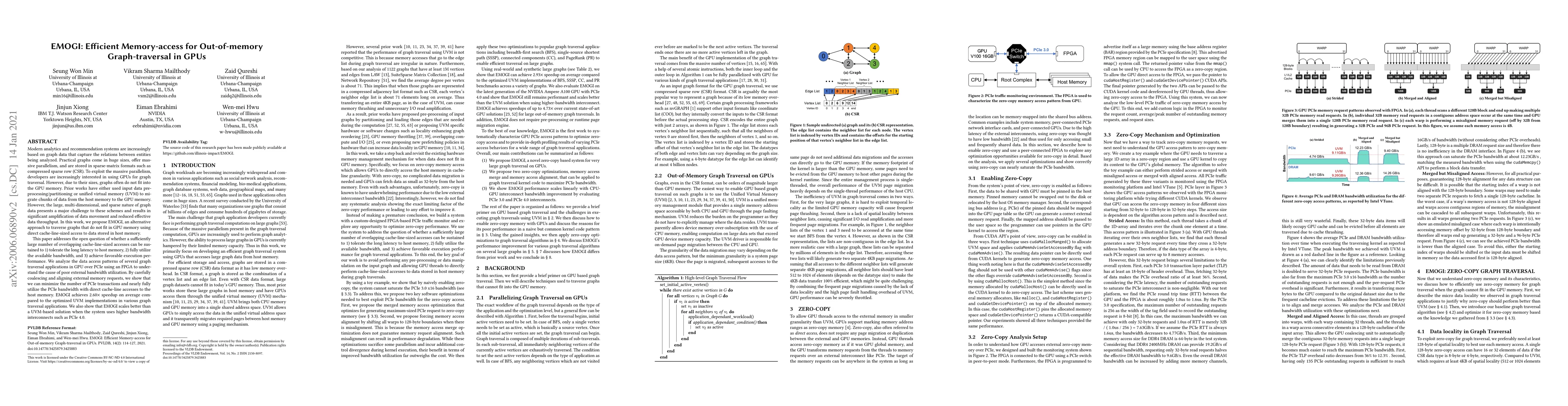 EMOGI proposes an efficient method for out-of-memory graph traversal in GPUs by leveraging direct cacheline-sized accesses to host memory, minimizing PCIe transactions and maximizing bandwidth utilization. It achieves up to 2.92× speedup over UVM-based solutions and scales better with higher bandwidth interconnects.