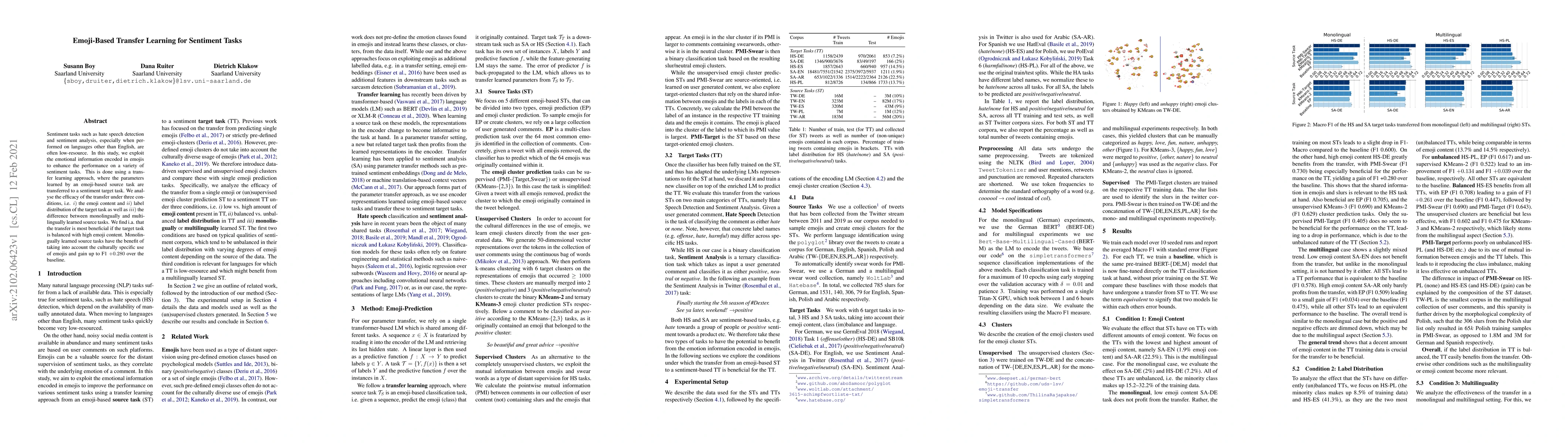 Sentiment tasks such as hate speech detection and sentiment analysis, especially when performed on languages other than English, are often low-resource. In this study, we exploit the emotional information encoded in emojis to enhance the performance on a variety of sentiment tasks. This is done using a transfer learning approach, where the parameters learned by an emoji-based source task are transferred to a sentiment target task. We analyse the efficacy of the transfer under three conditions, i.e. i) the emoji content and ii) label distribution of the target task as well as iii) the difference between monolingually and multilingually learned source tasks. We find i.a. that the transfer is most beneficial if the target task is balanced with high emoji content. Monolingually learned source tasks have the benefit of taking into account the culturally specific use of emojis and gain up to F1 +0.280 over the baseline.