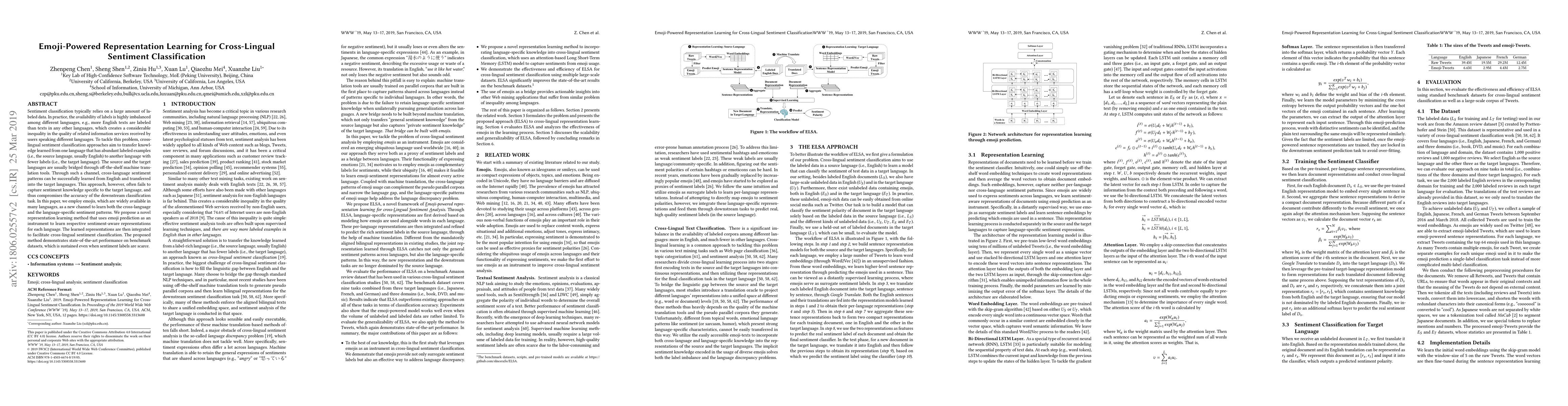 The paper introduces a novel representation learning framework, ELSA, that captures both general and language-specific sentiment knowledge for cross-lingual sentiment classification using emojis.
