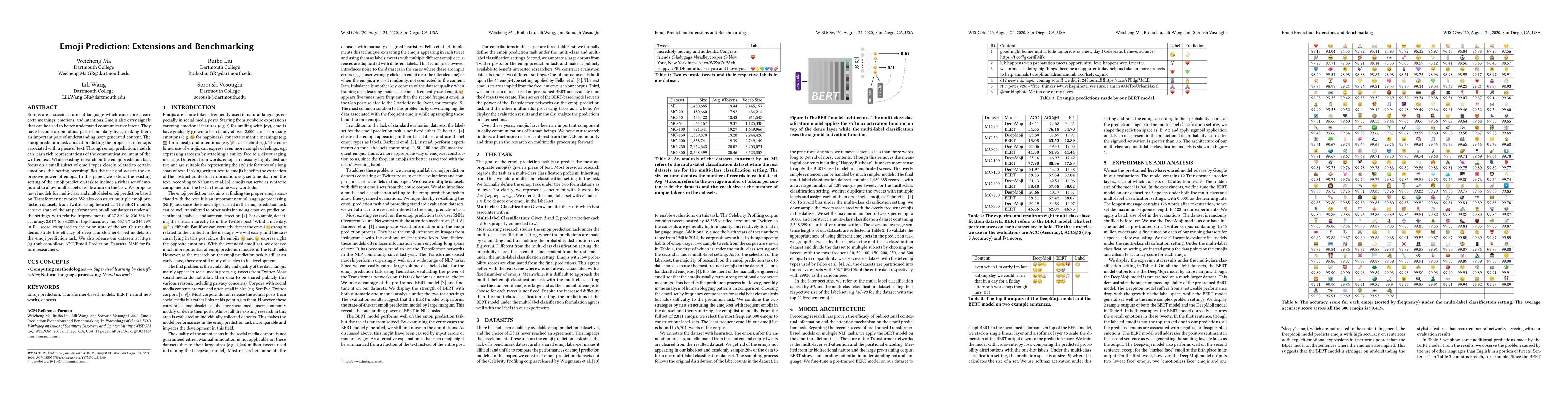This paper extends the emoji prediction task to include a broader range of emojis and multi-label classification, proposing novel Transformer-based models. BERT models achieve significant improvements in accuracy, top-5 accuracy, and F-1 score, demonstrating the effectiveness of deep learning for emoji prediction.