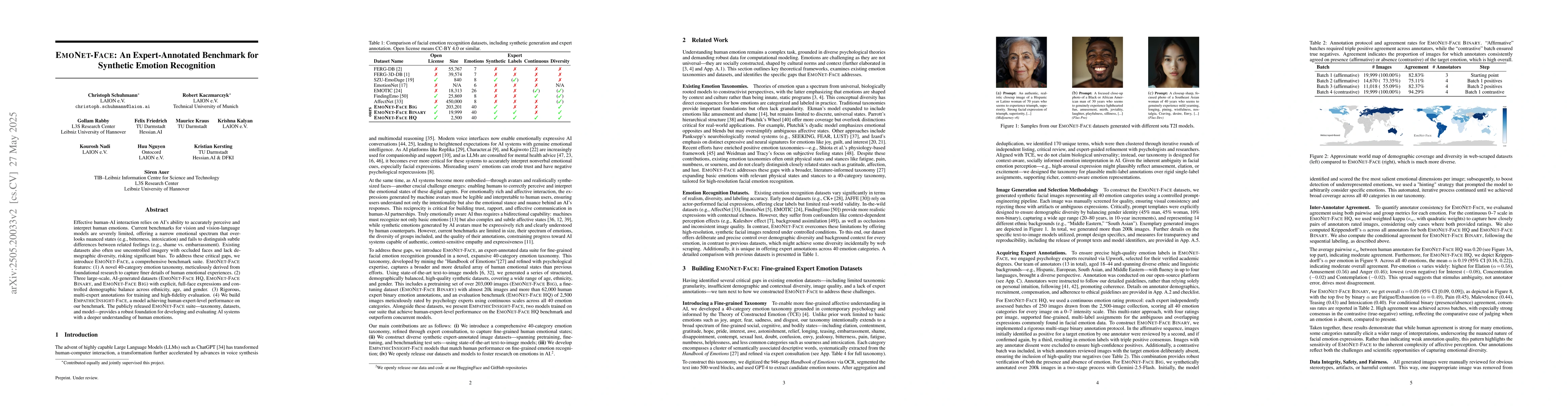 The research introduces EmoNet-Face, a benchmark suite for synthetic emotion recognition, featuring a 40-category emotion taxonomy, three large-scale AI-generated datasets (EmoNet HQ, Binary, and Big) with controlled demographic balance, and rigorous multi-expert annotations.
