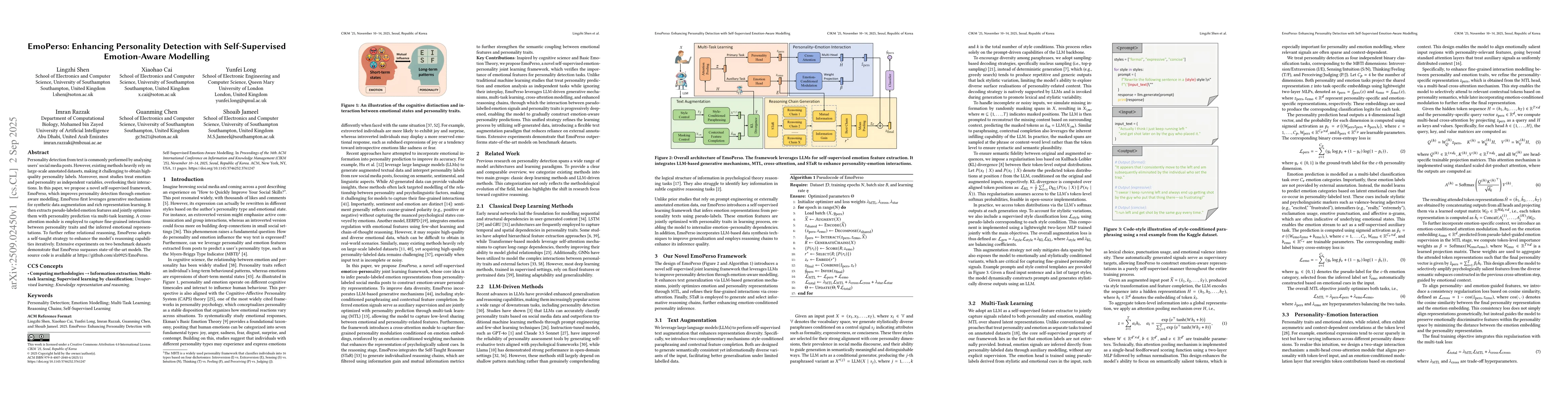Personality detection from text is commonly performed by analysing users' social media posts. However, existing methods heavily rely on large-scale annotated datasets, making it challenging to obtain high-quality personality labels. Moreover, most studies treat emotion and personality as independent variables, overlooking their interactions. In this paper, we propose a novel self-supervised framework, EmoPerso, which improves personality detection through emotion-aware modelling. EmoPerso first leverages generative mechanisms for synthetic data augmentation and rich representation learning. It then extracts pseudo-labeled emotion features and jointly optimizes them with personality prediction via multi-task learning. A cross-attention module is employed to capture fine-grained interactions between personality traits and the inferred emotional representations. To further refine relational reasoning, EmoPerso adopts a self-taught strategy to enhance the model's reasoning capabilities iteratively. Extensive experiments on two benchmark datasets demonstrate that EmoPerso surpasses state-of-the-art models. The source code is available at https://github.com/slz0925/EmoPerso.