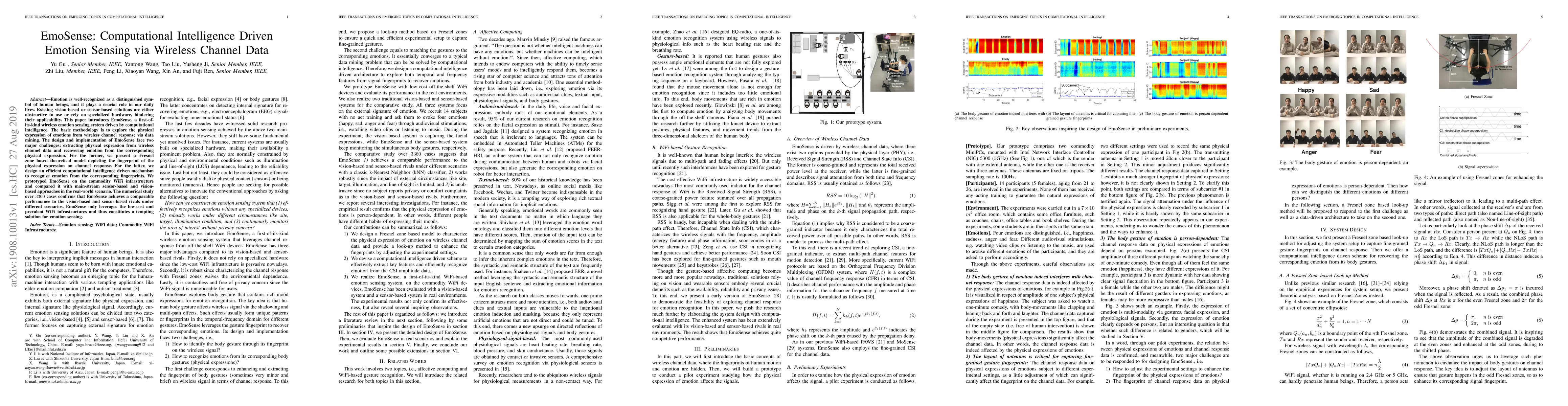 EmoSense is a novel wireless emotion sensing system utilizing computational intelligence to detect emotions from wireless channel data. It addresses the limitations of existing vision-based and sensor-based methods by leveraging low-cost WiFi infrastructure, achieving comparable performance in real-world scenarios.