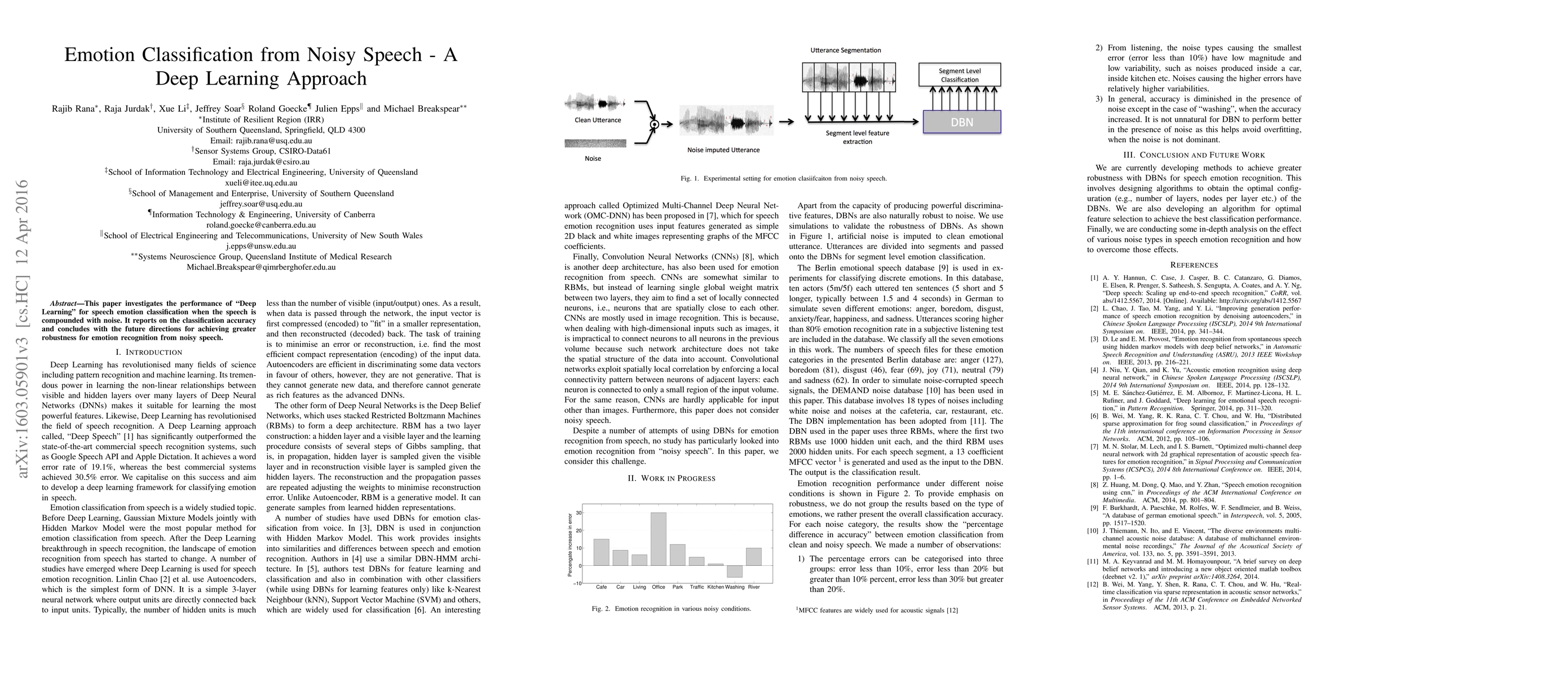 This paper explores the use of deep learning techniques to classify emotions in noisy speech, evaluating their accuracy and discussing strategies for enhancing robustness in future emotion recognition systems.