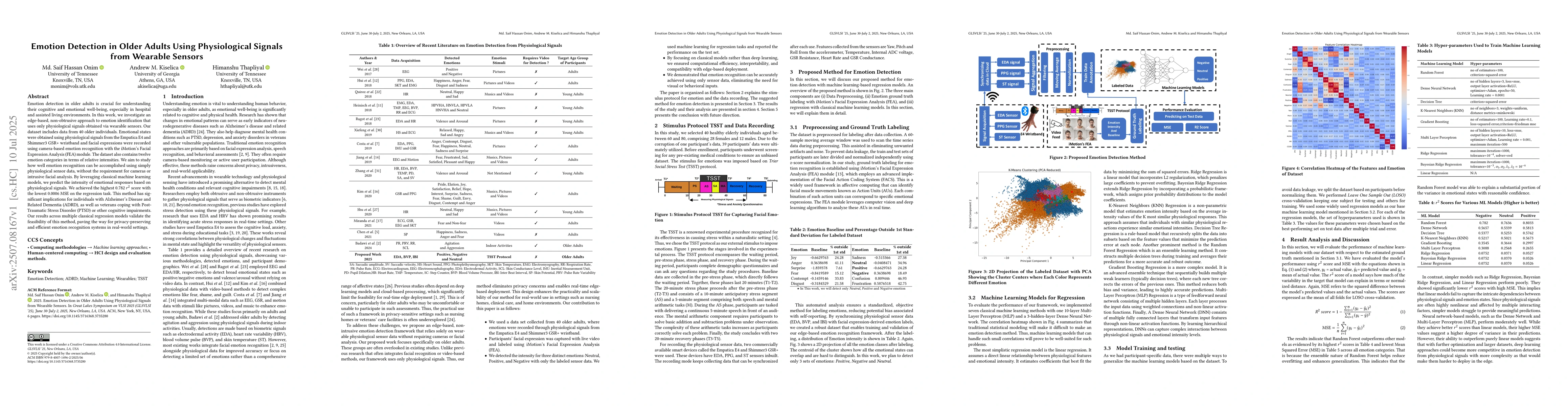 Emotion detection in older adults is crucial for understanding their cognitive and emotional well-being, especially in hospital and assisted living environments. In this work, we investigate an edge-based, non-obtrusive approach to emotion identification that uses only physiological signals obtained via wearable sensors. Our dataset includes data from 40 older individuals. Emotional states were obtained using physiological signals from the Empatica E4 and Shimmer3 GSR+ wristband and facial expressions were recorded using camera-based emotion recognition with the iMotion's Facial Expression Analysis (FEA) module. The dataset also contains twelve emotion categories in terms of relative intensities. We aim to study how well emotion recognition can be accomplished using simply physiological sensor data, without the requirement for cameras or intrusive facial analysis. By leveraging classical machine learning models, we predict the intensity of emotional responses based on physiological signals. We achieved the highest 0.782 r2 score with the lowest 0.0006 MSE on the regression task. This method has significant implications for individuals with Alzheimer's Disease and Related Dementia (ADRD), as well as veterans coping with Post-Traumatic Stress Disorder (PTSD) or other cognitive impairments. Our results across multiple classical regression models validate the feasibility of this method, paving the way for privacy-preserving and efficient emotion recognition systems in real-world settings.