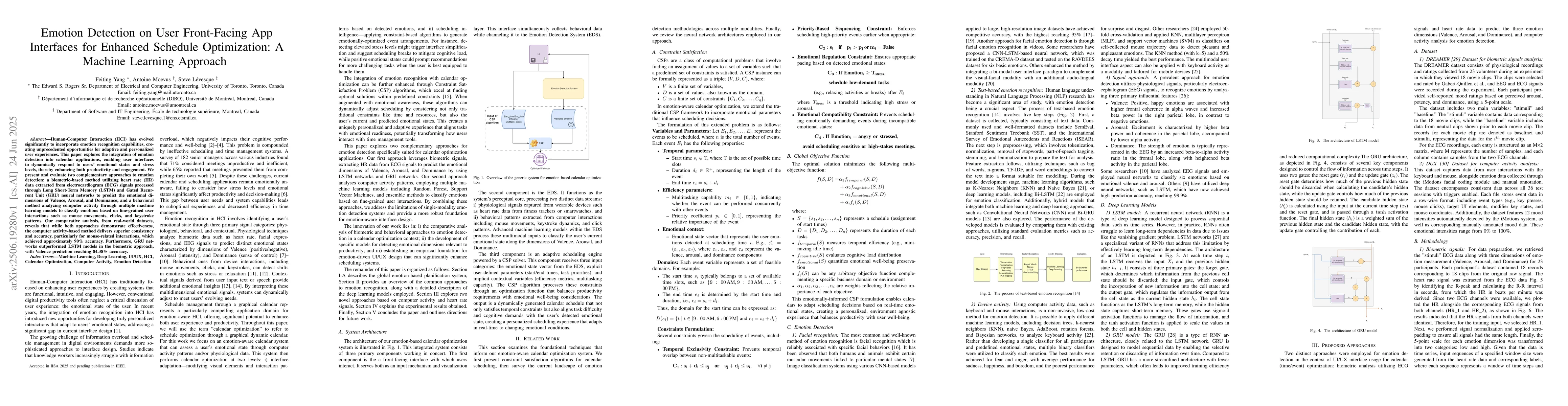 Human-Computer Interaction (HCI) has evolved significantly to incorporate emotion recognition capabilities, creating unprecedented opportunities for adaptive and personalized user experiences. This paper explores the integration of emotion detection into calendar applications, enabling user interfaces to dynamically respond to users' emotional states and stress levels, thereby enhancing both productivity and engagement. We present and evaluate two complementary approaches to emotion detection: a biometric-based method utilizing heart rate (HR) data extracted from electrocardiogram (ECG) signals processed through Long Short-Term Memory (LSTM) and Gated Recurrent Unit (GRU) neural networks to predict the emotional dimensions of Valence, Arousal, and Dominance; and a behavioral method analyzing computer activity through multiple machine learning models to classify emotions based on fine-grained user interactions such as mouse movements, clicks, and keystroke patterns. Our comparative analysis, from real-world datasets, reveals that while both approaches demonstrate effectiveness, the computer activity-based method delivers superior consistency and accuracy, particularly for mouse-related interactions, which achieved approximately 90\% accuracy. Furthermore, GRU networks outperformed LSTM models in the biometric approach, with Valence prediction reaching 84.38\% accuracy.