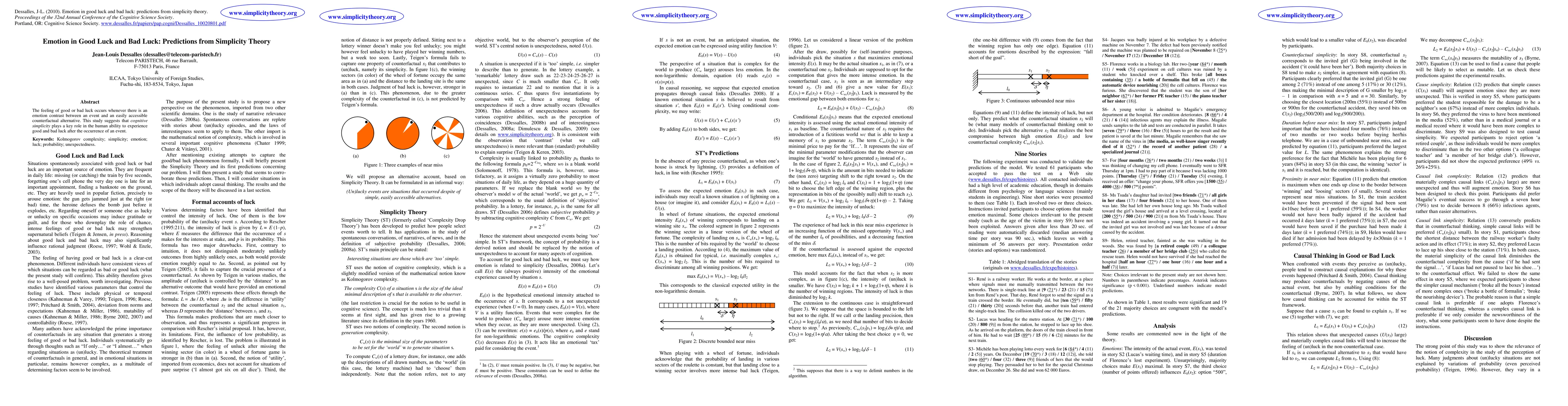 The feeling of good or bad luck occurs whenever there is an emotion contrast between an event and an easily accessible counterfactual alternative. This study suggests that cognitive simplicity plays a key role in the human ability to experience good and bad luck after the occurrence of an event.