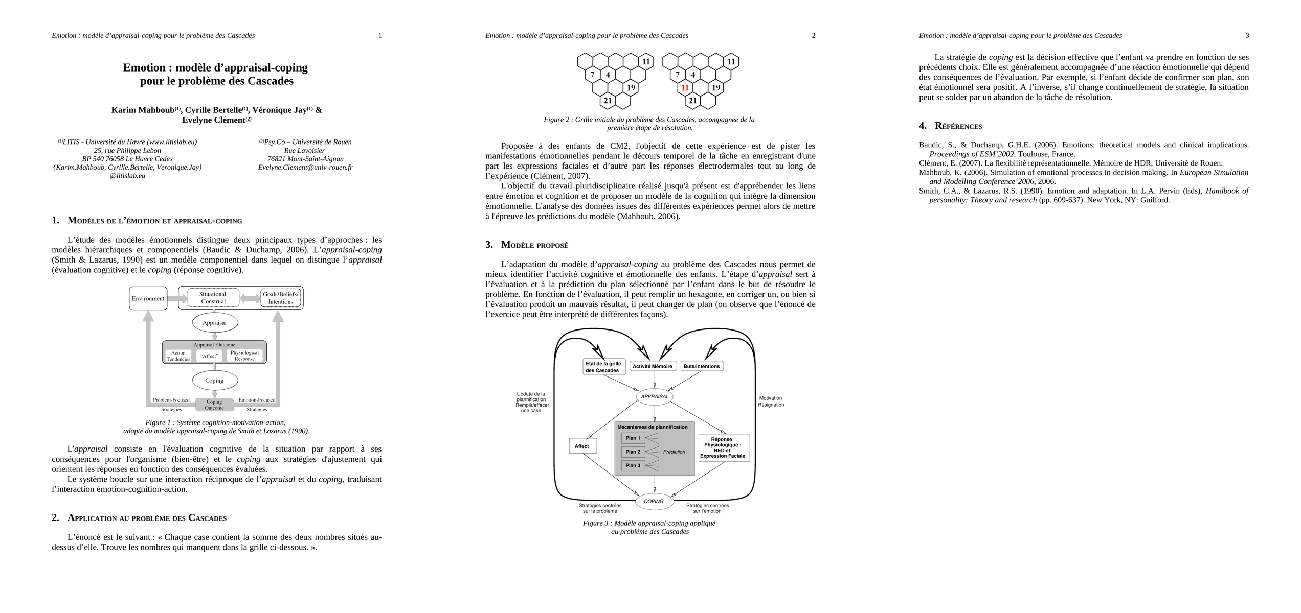 Modeling emotion has become a challenge nowadays. Therefore, several models have been produced in order to express human emotional activity. However, only a few of them are currently able to express the close relationship existing between emotion and cognition. An appraisal-coping model is presented here, with the aim to simulate the emotional impact caused by the evaluation of a particular situation (appraisal), along with the consequent cognitive reaction intended to face the situation (coping). This model is applied to the ?Cascades? problem, a small arithmetical exercise designed for ten-year-old pupils. The goal is to create a model corresponding to a child's behavior when solving the problem using his own strategies.