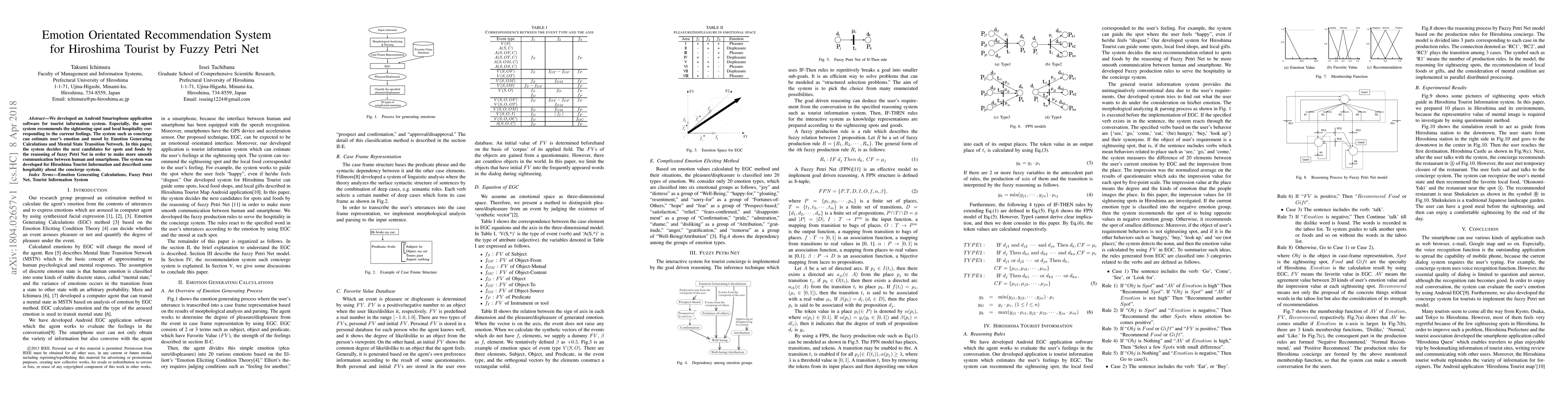 This paper presents an Android application for a tourist information system in Hiroshima, which recommends sightseeing spots and local hospitality based on the user's current emotions. The system uses fuzzy Petri Net reasoning to facilitate smooth human-smartphone interaction and was developed with a concierge-like agent that estimates user emotions through Emotion Generating Calculations and Mental State Transition Network.