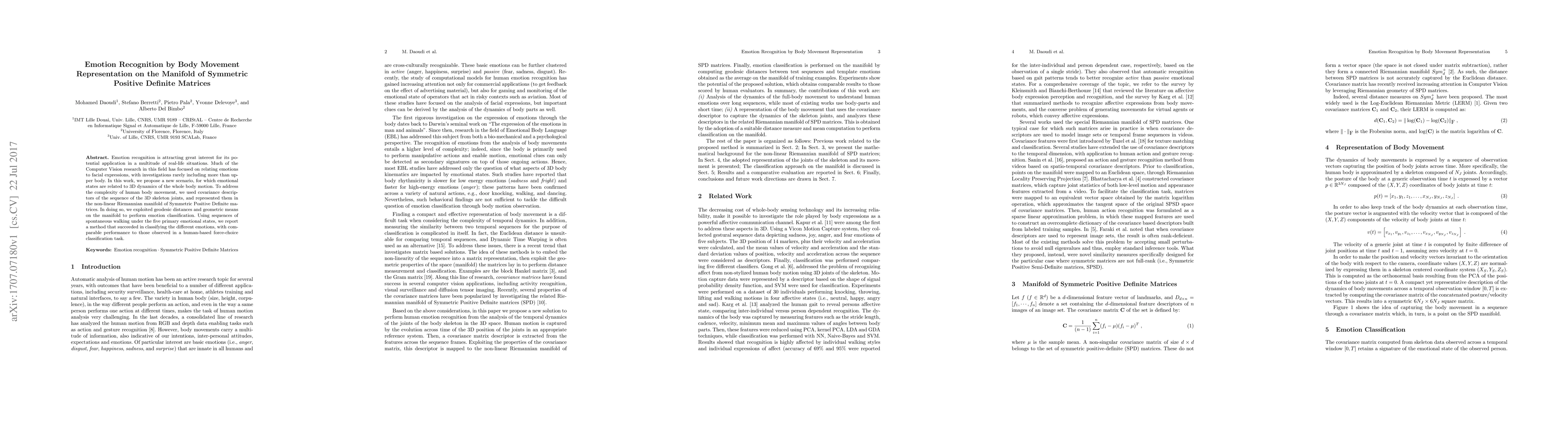 Emotion recognition is attracting great interest for its potential application in a multitude of real-life situations. Much of the Computer Vision research in this field has focused on relating emotions to facial expressions, with investigations rarely including more than upper body. In this work, we propose a new scenario, for which emotional states are related to 3D dynamics of the whole body motion. To address the complexity of human body movement, we used covariance descriptors of the sequence of the 3D skeleton joints, and represented them in the non-linear Riemannian manifold of Symmetric Positive Definite matrices. In doing so, we exploited geodesic distances and geometric means on the manifold to perform emotion classification. Using sequences of spontaneous walking under the five primary emotional states, we report a method that succeeded in classifying the different emotions, with comparable performance to those observed in a human-based force-choice classification task.